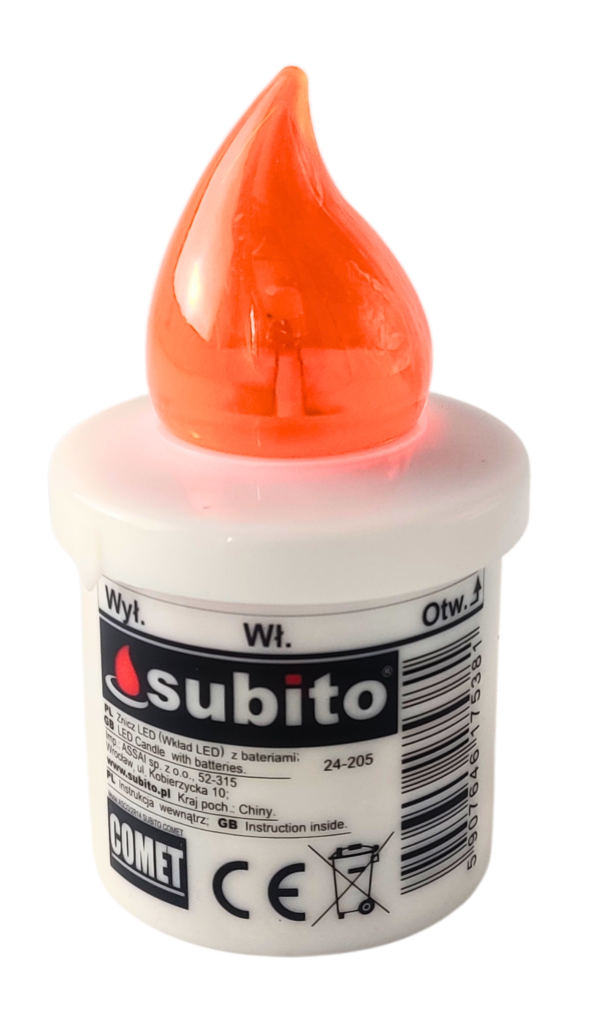 Klasická LED vložka do svíček Subito , napájená bateriemi R14. Pasuje na většinu skleněných a plastových svíček nebo různé typy svíček a luceren. LED vložka poskytuje příjemné světlo a široká škála barev umožňuje vytvořit zajímavé osvětlení.