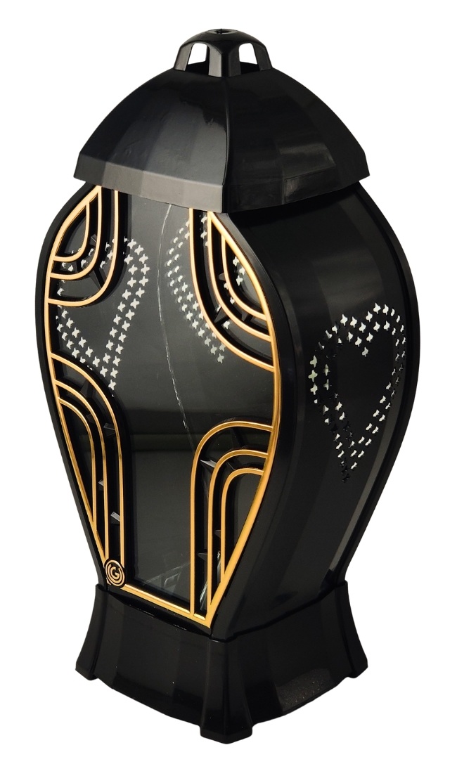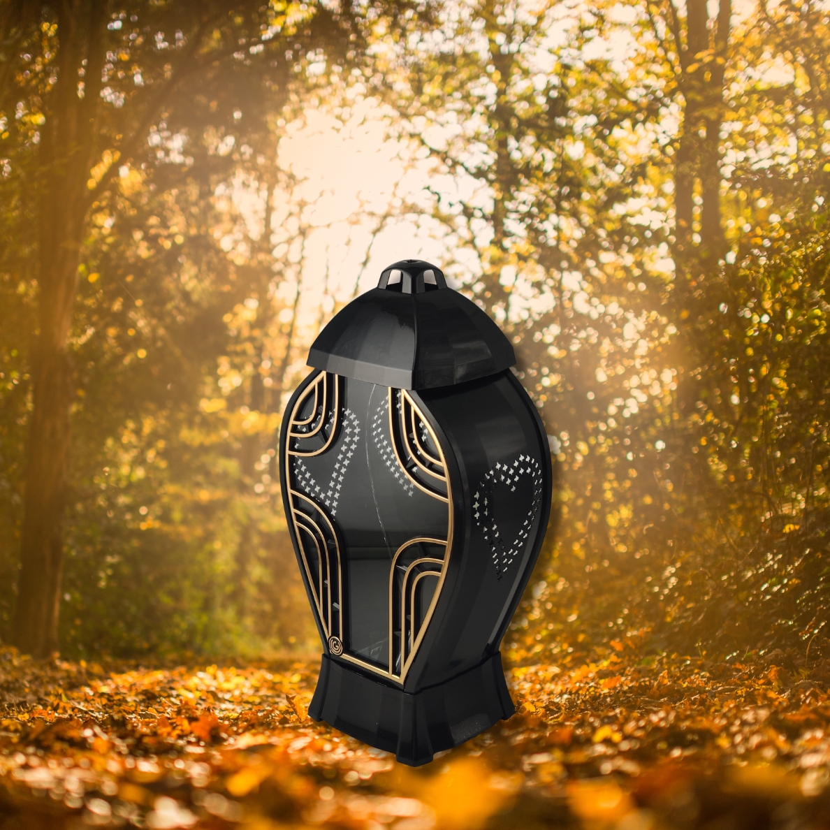 Elegantní svíčka GLAMUR ve velké váze se vyznačuje decentním motivem zlatého kříže v černé povrchové úpravě. Je odolná, stabilní a odolná vůči povětrnostním vlivům – perfektní dekorace na náhrobek k připomenutí památky na vaše blízké.