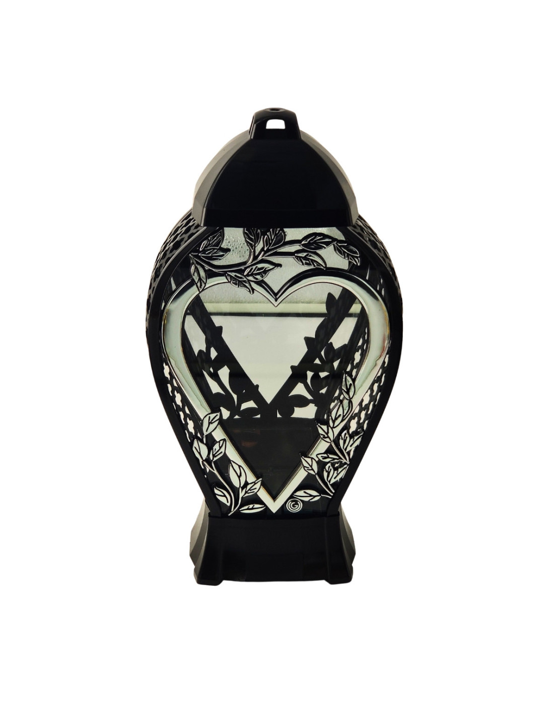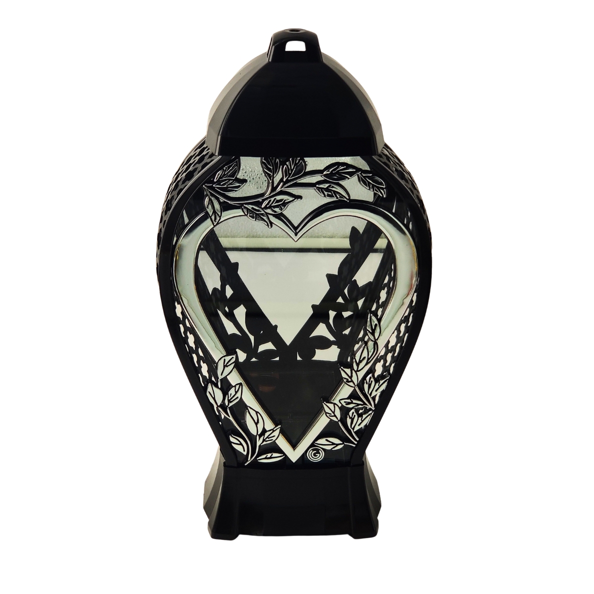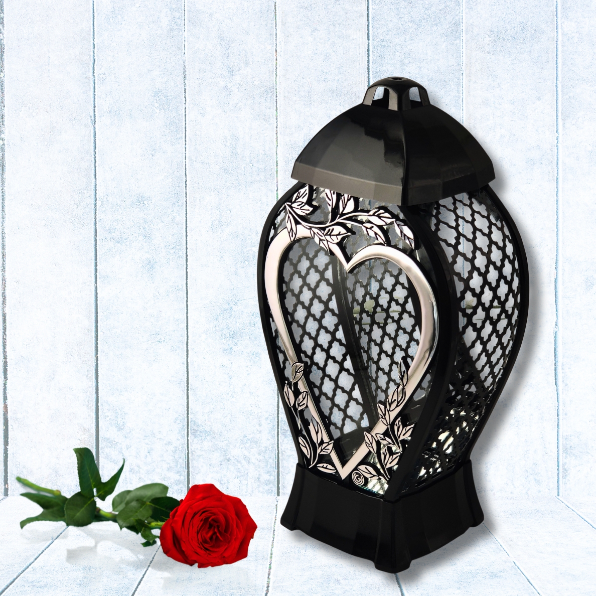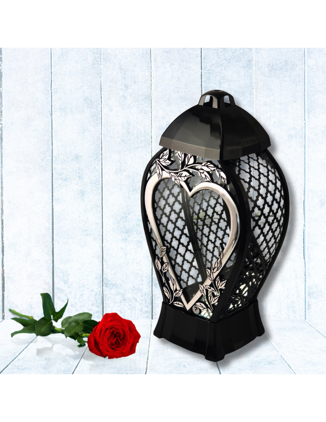 GLAS HITElegantní svíčka GLAMUR Large Openwork Vase se vyznačuje decentním motivem stříbrného srdce v černé povrchové úpravě. Je odolná, stabilní a odolná vůči povětrnostním vlivům – perfektní dekorace na náhrobek k uctění památky vašich blízkých.