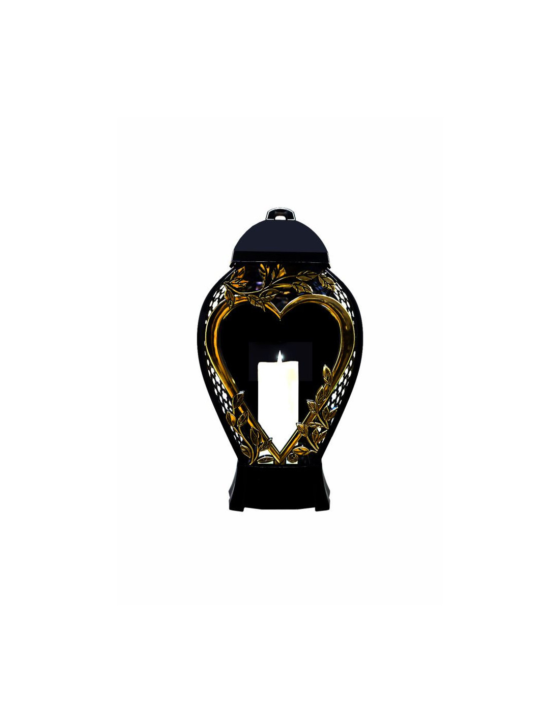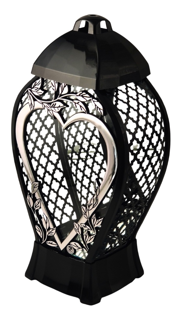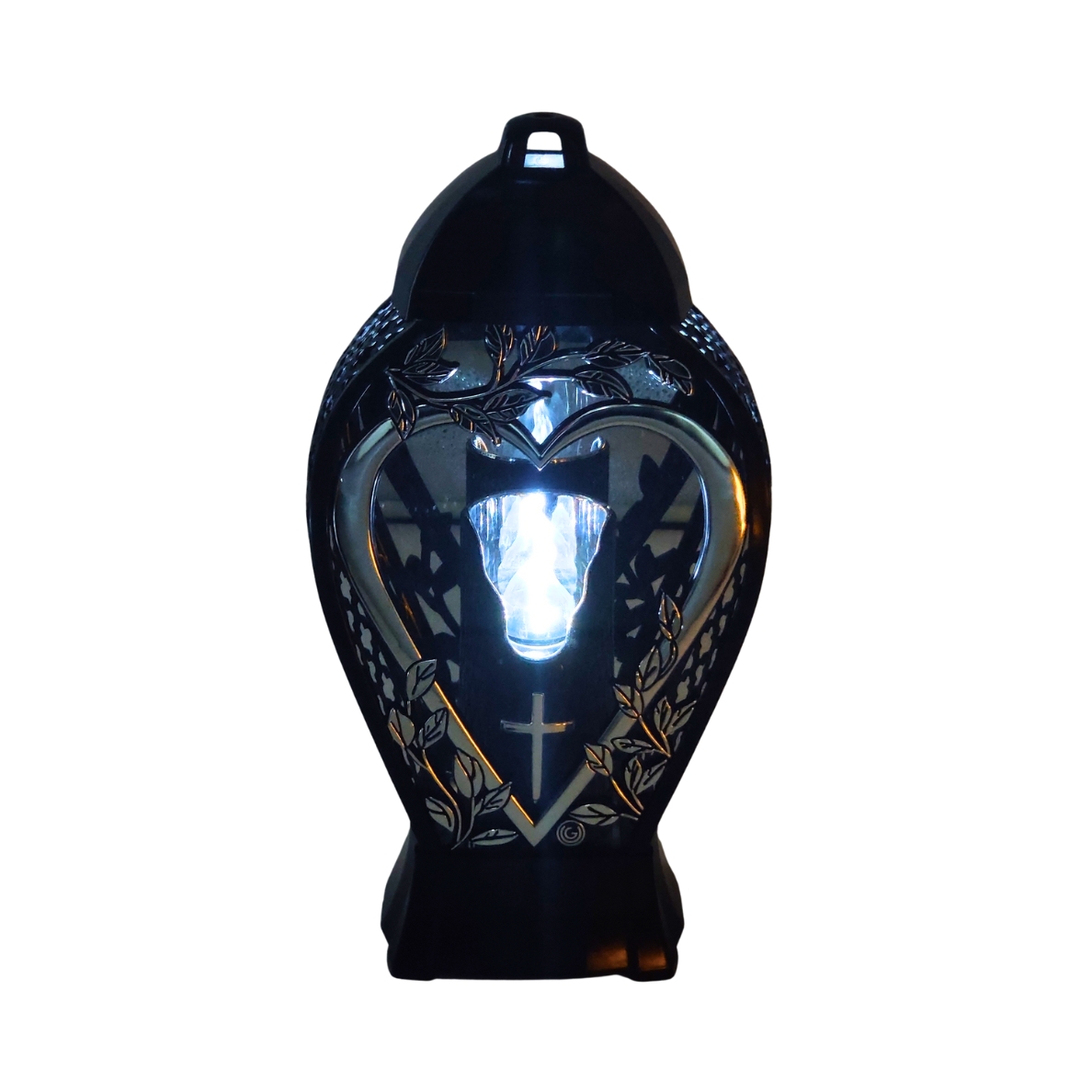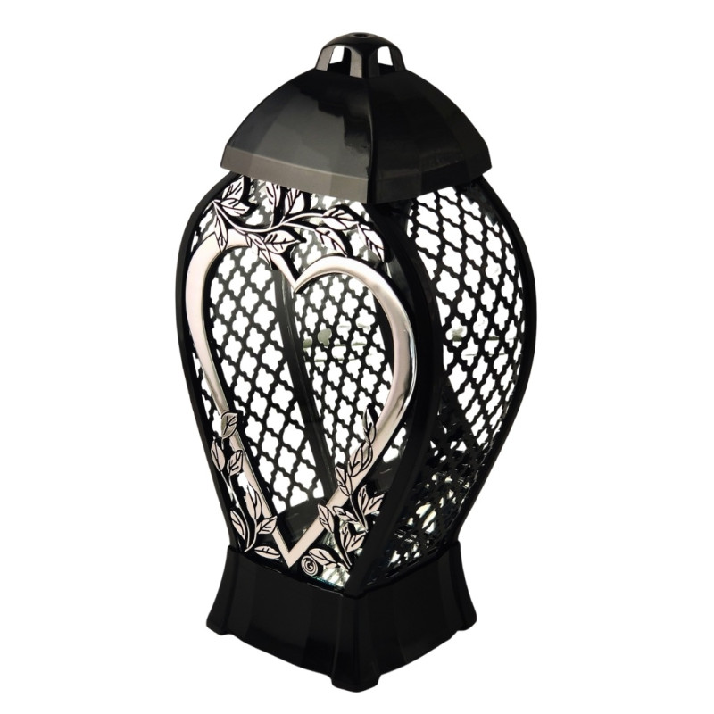GLAS HITElegantní svíčka GLAMUR Large Openwork Vase se vyznačuje decentním motivem stříbrného srdce v černé povrchové úpravě. Je odolná, stabilní a odolná vůči povětrnostním vlivům – perfektní dekorace na náhrobek k uctění památky vašich blízkých.