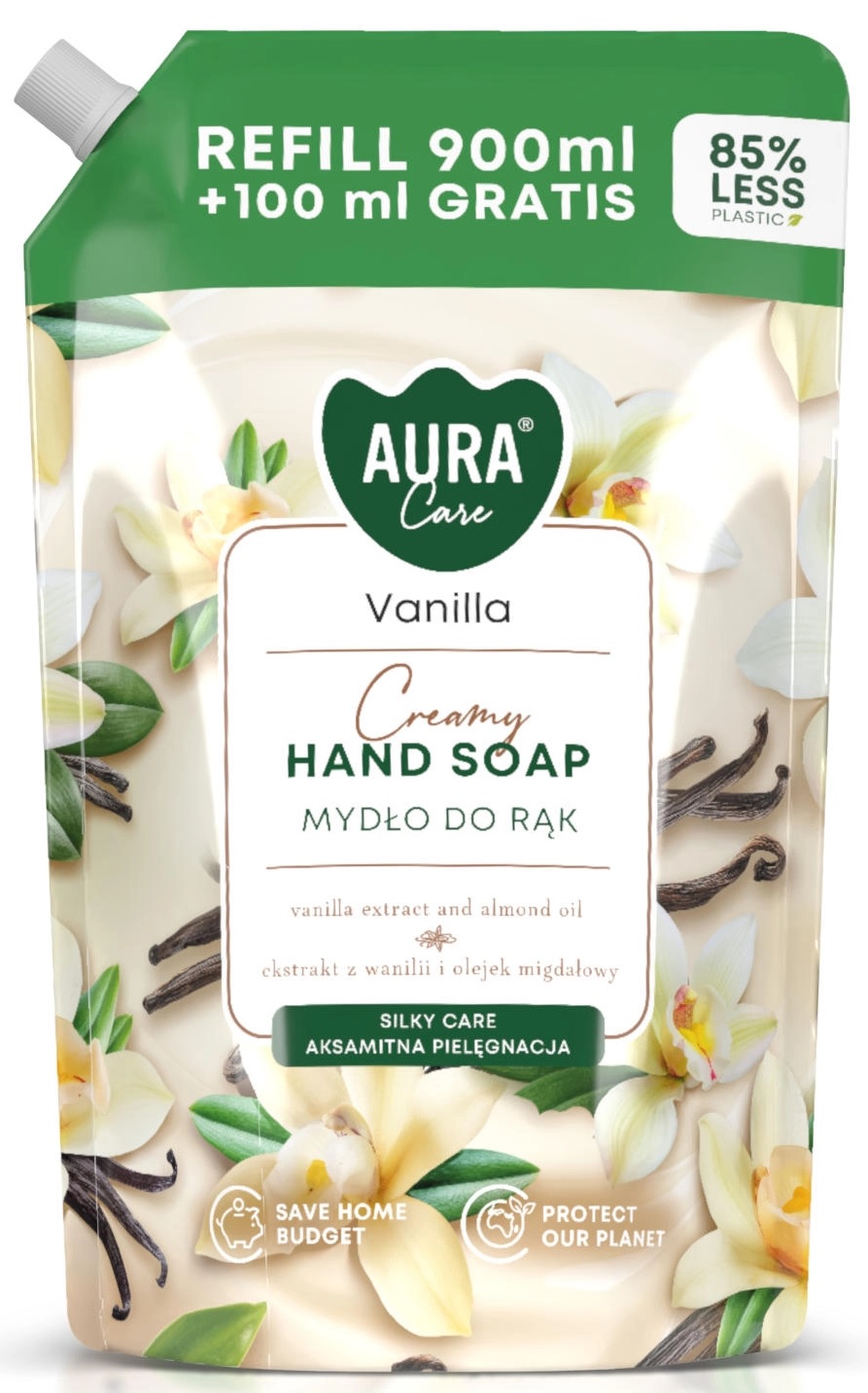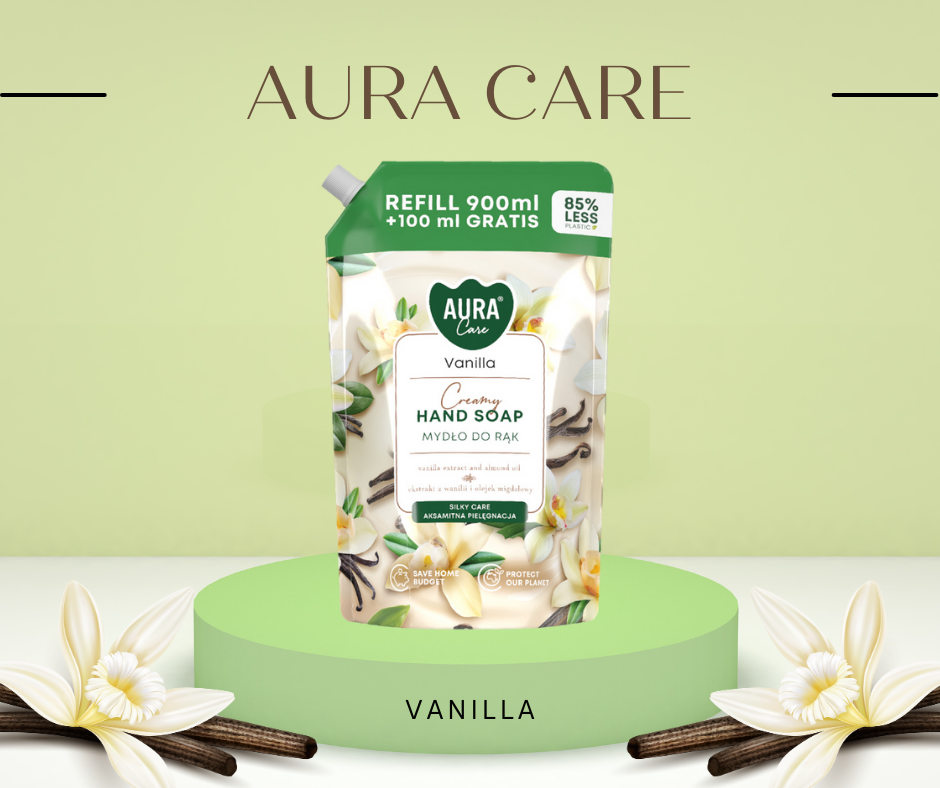 Zásoba hydratačního vonného tekutého mýdla od AURA s vanilkovým aroma, které zahalí pokožku do jemnosti a navodí stav relaxace a sladkého potěšení. Mýdlo jemně myje, zanechává pokožku jemnou a hedvábně jemnou na dotek a vůně kombinují svěžest a hřejivou sladkost, což přináší efekt osvěžení pokožky a pocit relaxace při každé aplikaci.