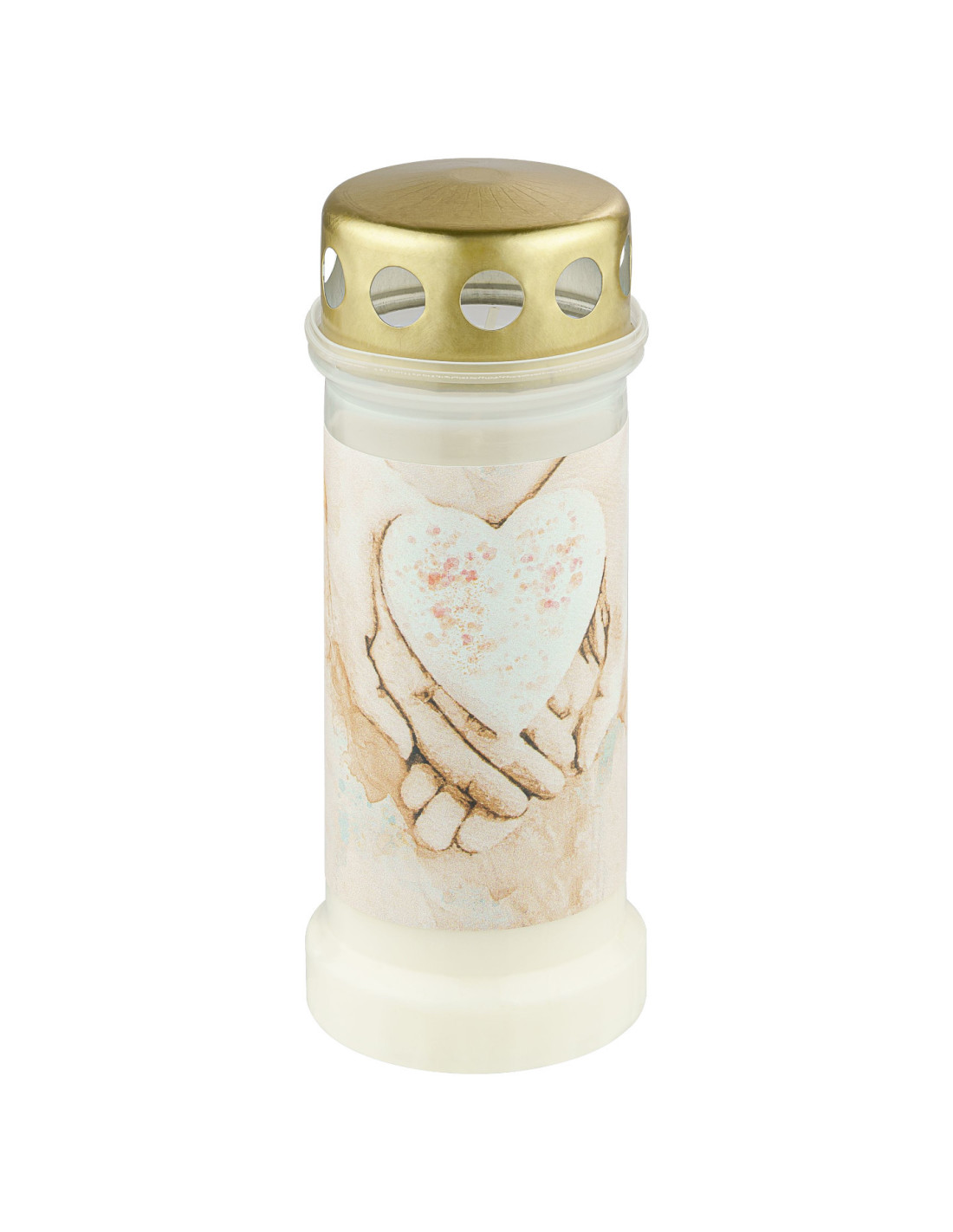 Dekorativní svíčky se vzorem ruky a srdce. Díky velké základně jsou velmi stabilní a díky speciální struktuře a „kapotě“ jsou dokonale chráněny proti větru a vodě. Elegantní a moderní vypadají skvěle jako hlavní dekorace náhrobků.