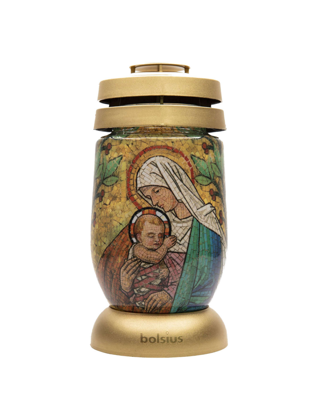Dekorativní lucerna s motivem vitráže. Vyrobeno z kvalitního průhledného skla, přes které je krásně vidět plamen. Díky své velké základně je velmi stabilní a díky speciální konstrukci a "kapotě" je vložka uvnitř dokonale chráněna proti větru a vodě. Elegantní a moderní vypadá skvěle jako hlavní dekorace náhrobků.