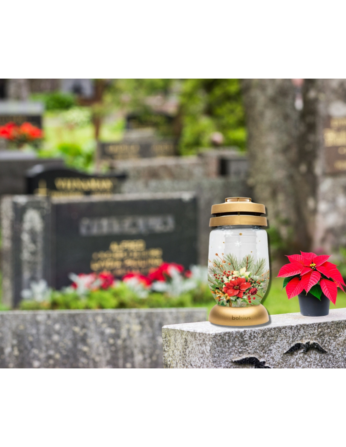 Dekorative Weihnachtslaterne mit Weihnachtskranz- und Schneeflockenmotiv. Hergestellt aus hochwertigem, transparentem Glas, ist die Flamme schön sichtbar. Der große Standfuß sorgt für hohe Stabilität und dank der speziellen Konstruktion und der „Kappe“ ist der Einsatz im Inneren perfekt vor Wind und Wasser geschützt. Elegant und modern, eignet sie sich hervorragend als Hauptdekoration auf Grabsteinen.