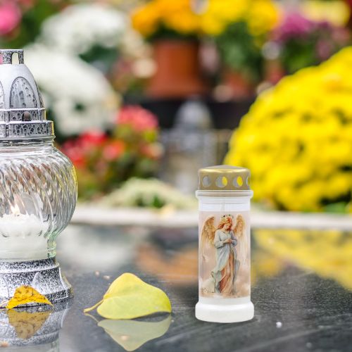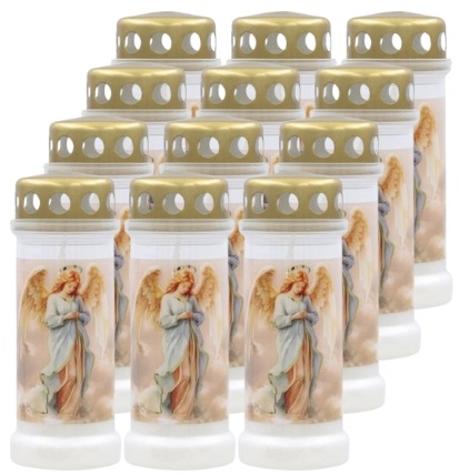 Gefüllte Kunststoffkerzen im goldenen Stil von BOLSIUS . Die Grafik mit einem goldschimmernden Engel ist eine Kombination aus modernem Design und klassischer, sakraler Symbolik. Der solide, breite Standfuß sorgt für Stabilität und der dicke, hochwertige Kunststoff garantiert Langlebigkeit und Witterungsbeständigkeit. Der goldene Metalldeckel verleiht einen edlen Charakter und unterstreicht die Eleganz des Ganzen, und das Wachs ohne Palmölzusatz macht die Kerze zu einer ökologischen Wahl. Sie kann als eigenständige Kerze oder als Einsatz für größere Glaslaternen oder Windlichter verwendet werden. Es ist eine ausgezeichnete Wahl für Menschen, die Wert auf Ästhetik, Haltbarkeit und tiefe Symbolik legen.