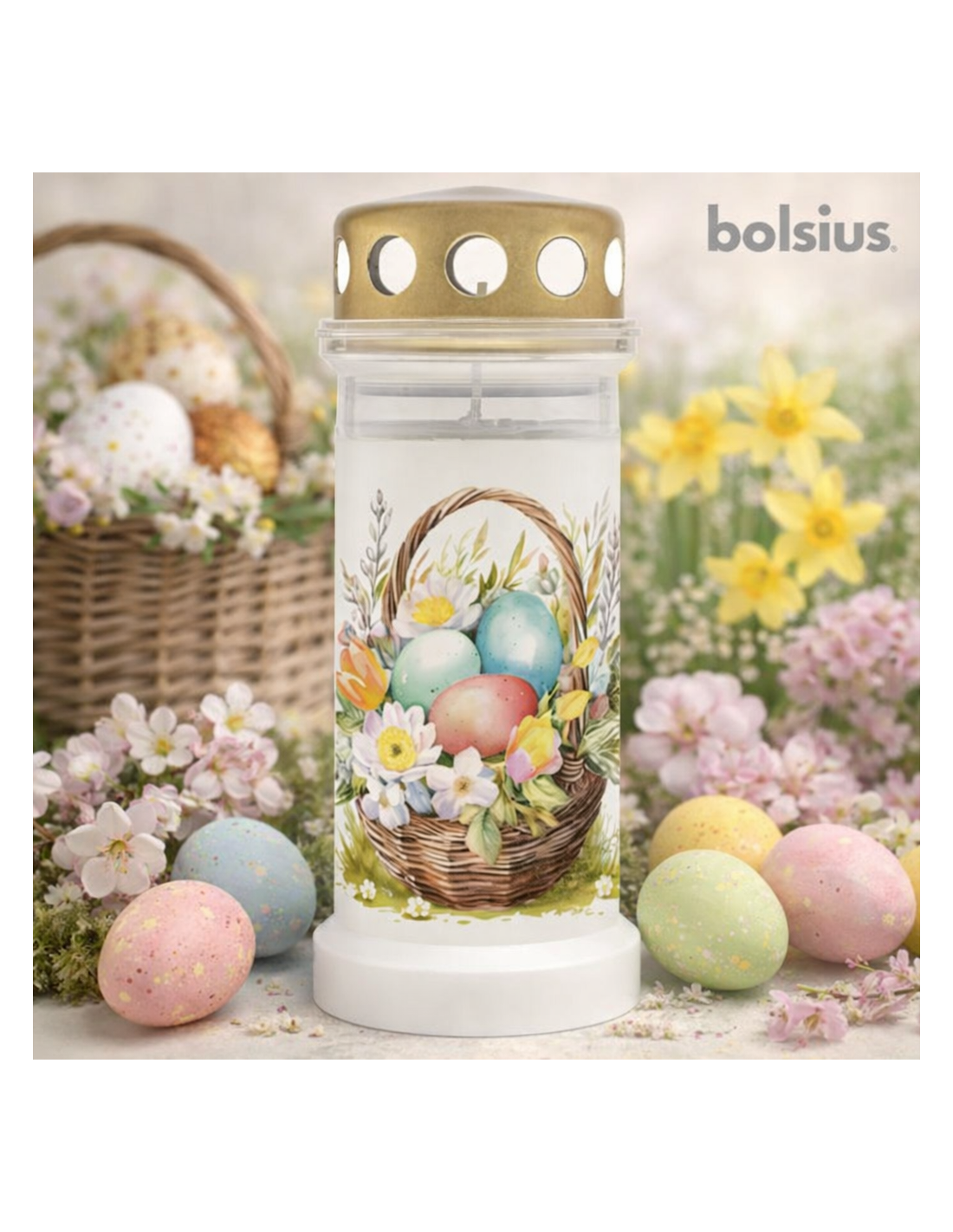 Eine formgepresste Kunststoffkerze im dezenten Pastellstil der Marke BOLSIUS. Das Motiv, ein Osterkorb gefüllt mit bunten Ostereiern und frühlingshaften Akzenten, schafft eine warme, festliche Atmosphäre und symbolisiert Wiedergeburt, Hoffnung und neues Leben. Die zarten Farben und die harmonische Komposition verleihen der Kerze ein elegantes und ruhiges Aussehen, das perfekt zur österlichen Tradition der Besinnung passt.