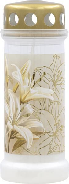 Eine gegossene Kunststoffkerze im goldenen Stil von BOLSIUS . Die Grafik mit goldschimmernden Lilien ist eine Kombination aus modernem Design und floraler, edler Eleganz. Der solide, breite Standfuß sorgt für Stabilität und der dicke, hochwertige Kunststoff garantiert Langlebigkeit und Witterungsbeständigkeit. Der goldene Metalldeckel verleiht einen edlen Charakter und unterstreicht die Eleganz des Ganzen, und das Wachs ohne Palmölzusatz macht die Kerze zu einer ökologischen Wahl. Sie kann als eigenständige Kerze oder als Einsatz für größere Glaslaternen oder Windlichter verwendet werden. Es ist eine ausgezeichnete Wahl für Menschen, die Wert auf Ästhetik, Haltbarkeit und tiefe Symbolik legen.