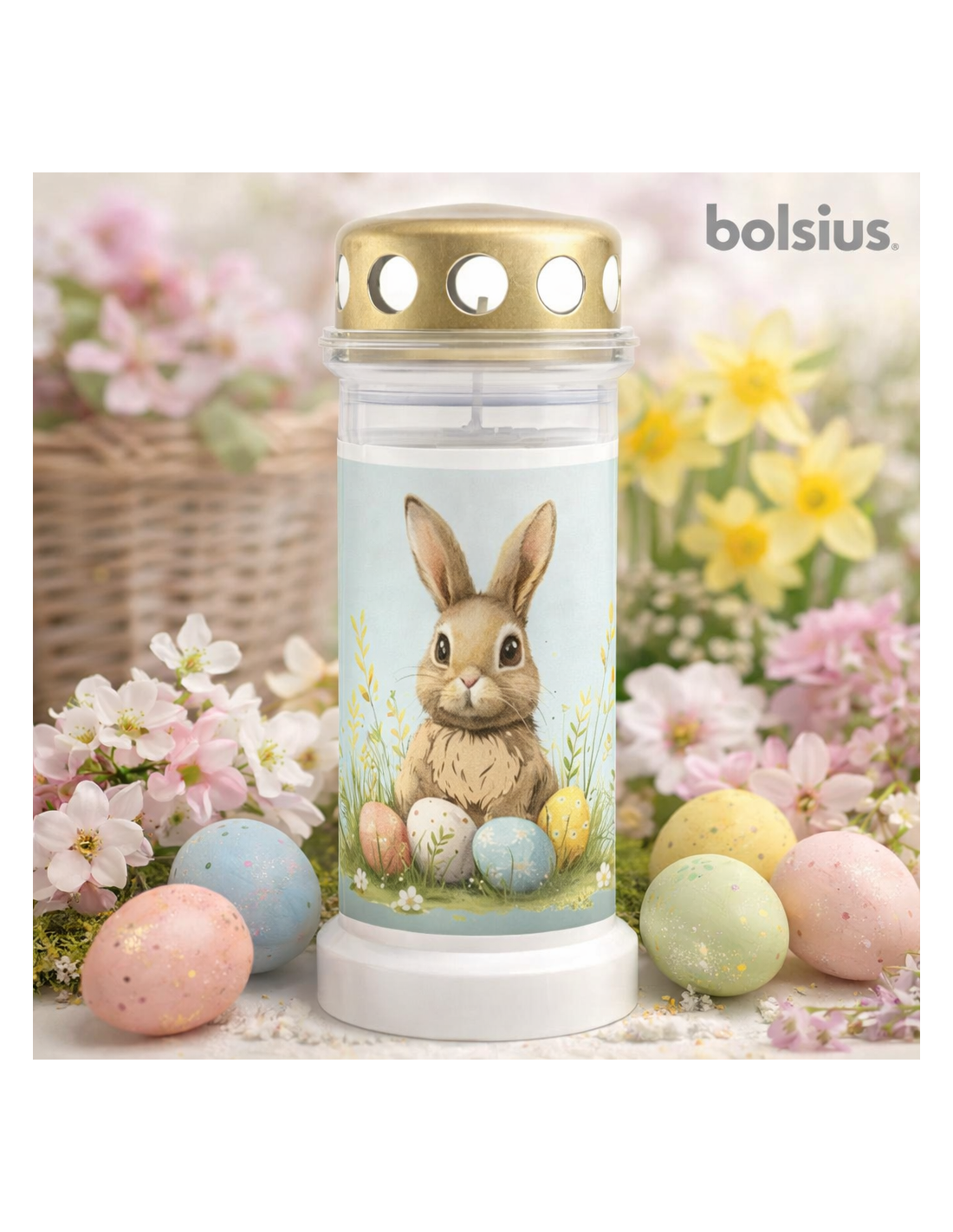 Eine formgepresste Kunststoffkerze im dezenten Pastellstil der Marke BOLSIUS. Ein pastellfarbener Hase und Ostereier bilden ein Motiv, das eine warme Frühlingsstimmung erzeugt und die Symbolik von Wiedergeburt, Hoffnung und neuem Leben aufgreift. Die zarten Farben und das dezente Design verleihen der Kerze ein elegantes und ruhiges Aussehen, das perfekt zur Ostertradition der Besinnung passt.