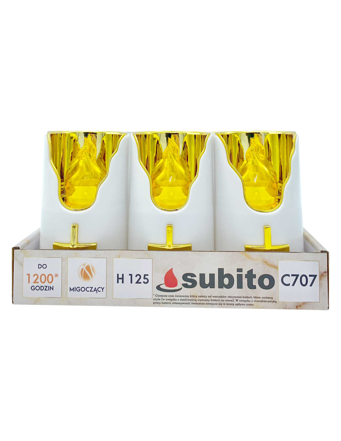 SUBITO LED-Kerzen werden sorgfältig und ästhetisch hergestellt. Mit SUBITO LED-Kerzen aus wachsgetreu imitierendem Material lassen sich viele interessante Arrangements (Dekorationen, Laternen) gestalten. Die verwendeten technischen Lösungen erzeugen den Effekt einer echten Kerzenflamme (einschließlich einer sich bewegenden Kerzenflamme, einer blinkenden Diode).
