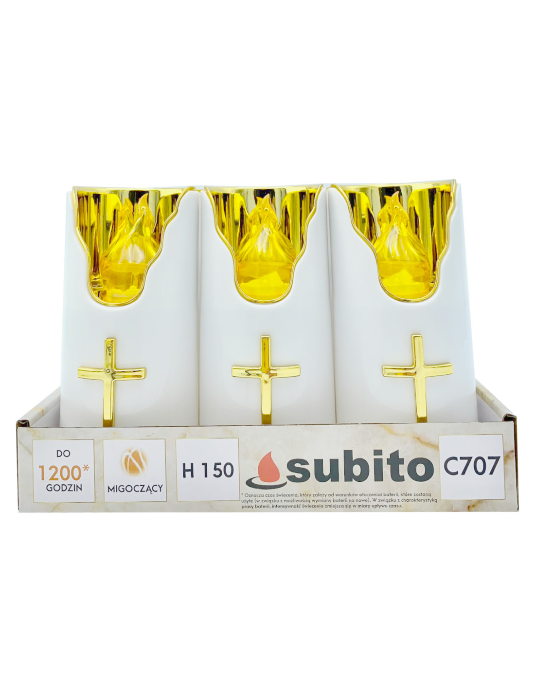 SUBITO LED-Kerzen werden sorgfältig und ästhetisch hergestellt. Mit SUBITO LED-Kerzen aus wachsgetreu imitierendem Material lassen sich viele interessante Arrangements (Dekorationen, Laternen) gestalten. Die verwendeten technischen Lösungen erzeugen den Effekt einer echten Kerzenflamme (einschließlich einer sich bewegenden Kerzenflamme, einer blinkenden Diode).