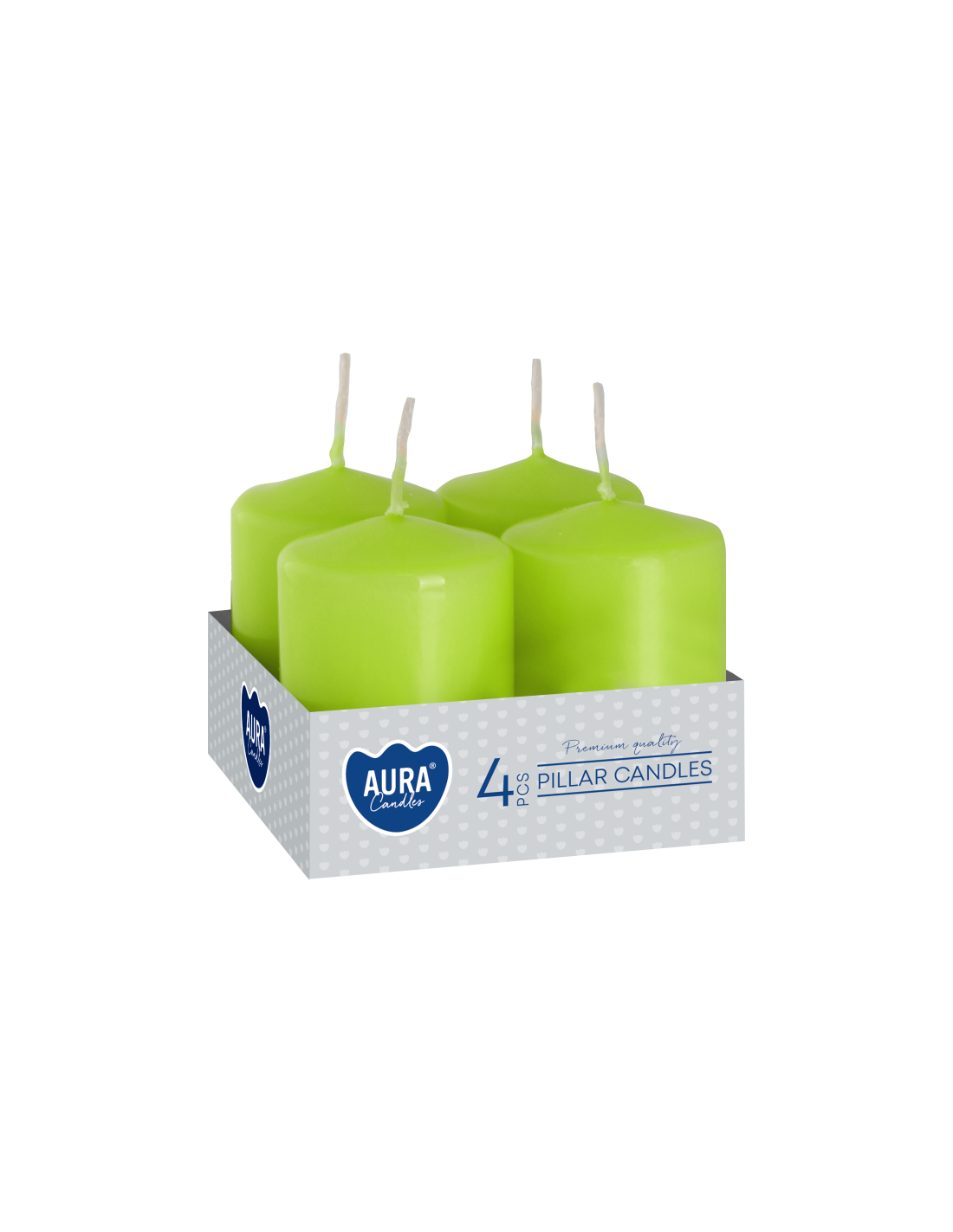 Ein Set aus vier kleinen Stumpenkerzen von AURA , in einem hellen, hellgrünen Farbton, der perfekt zu Frühlings- und Feiertagsarrangements passt. Zylinder in dieser Farbe eignen sich perfekt für die Dekoration von Feiertagstischen oder für die Gestaltung frühlingshafter, natürlicher Stile, die eine frische und fröhliche Atmosphäre schaffen. Hellgrüne Votivkerzen sind eine tolle Möglichkeit, Ihrer Kreativität Ausdruck zu verleihen.