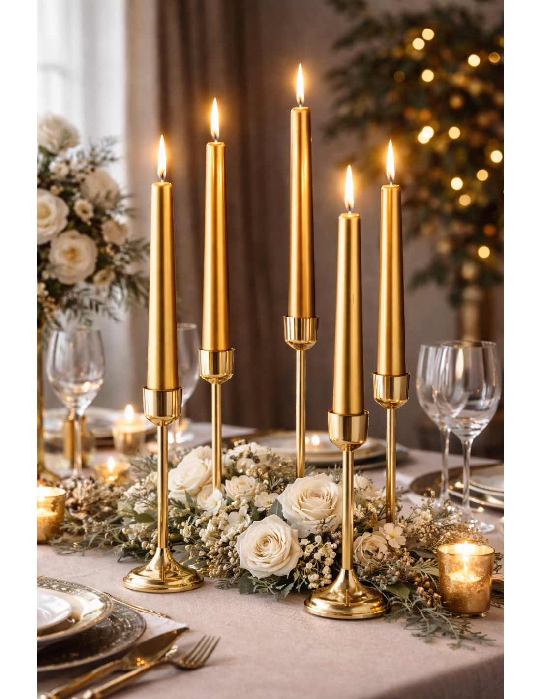 Metallisches Gold ist eine elegante und warme Farbe, die das Licht wunderschön reflektiert und jedem Arrangement Glanz und Raffinesse verleiht. Sie eignet sich perfekt für Feierlichkeiten wie Hochzeiten, Feiertage, Jubiläen und festliche Dinner. Sie symbolisiert Fülle, Erfolg und die Einzigartigkeit des Augenblicks und schafft gleichzeitig eine Atmosphäre von Wärme und Feierlichkeit. Gold ist die ideale Wahl, wenn Sie die festliche Stimmung Ihrer Tischdekoration unterstreichen möchten.