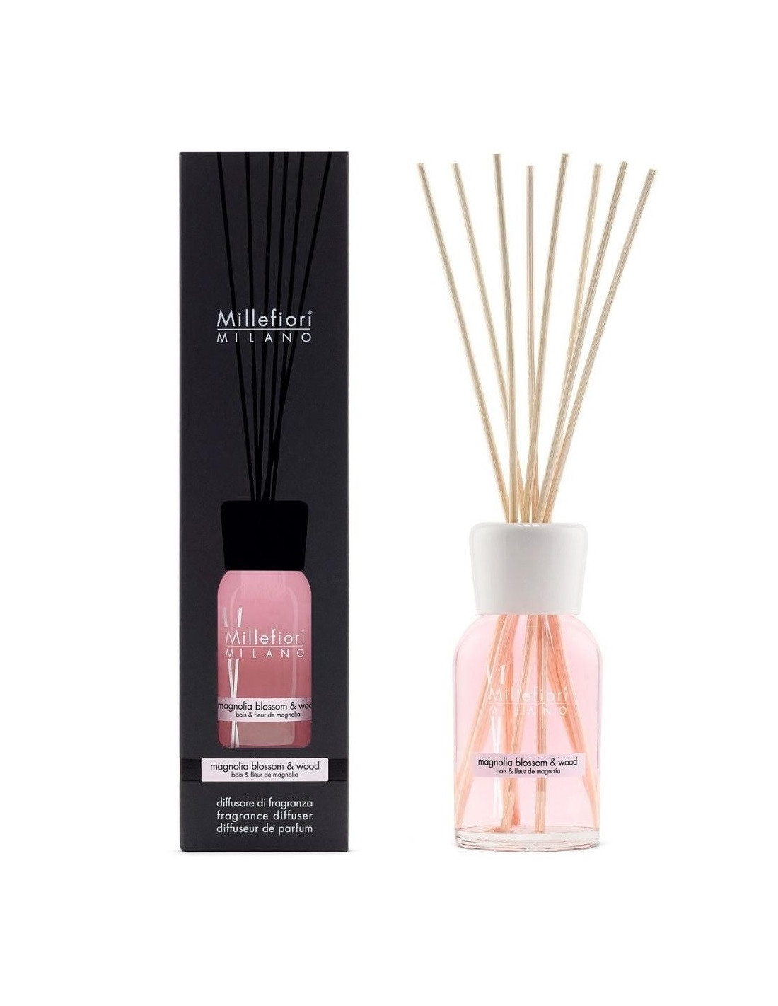 Difuzér s ratanovými tyčinkami od Millefiori MILANO s vôňou MAGNOLIA BLOSSOM & WOOD. Svieža a jemná vôňa magnólie v kombinácii s rafinovanými tónmi santalového dreva bude perfektne pôsobiť v obývacej izbe, spálni alebo kancelárii a dodá interiéru eleganciu a sviežosť.