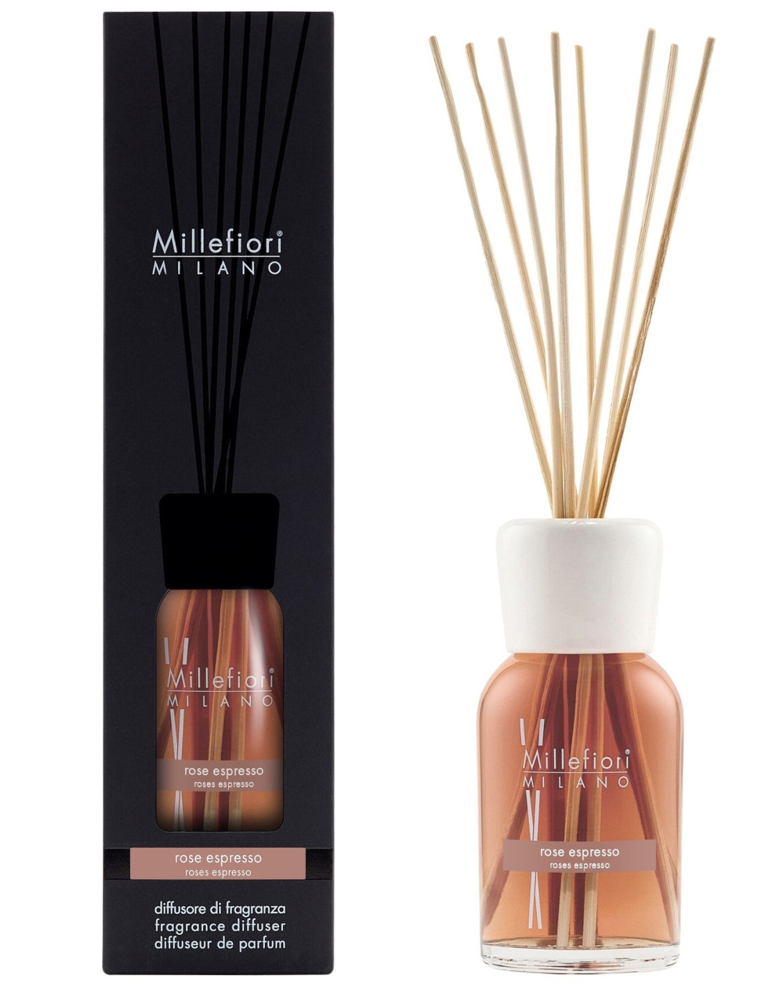 Dyfuzor z patyczkami rattanowymi marki Millefiori MILANO o zapachu ROSE ESPRESSO. Aromat białych kwiatów złączony z nutą świeżo mielonej kawy dopełniony płatkami róż i wanilii doskonale sprawdzi się w salonie, sypialni czy biurze, dodając wnętrzu elegancji i świeżości.