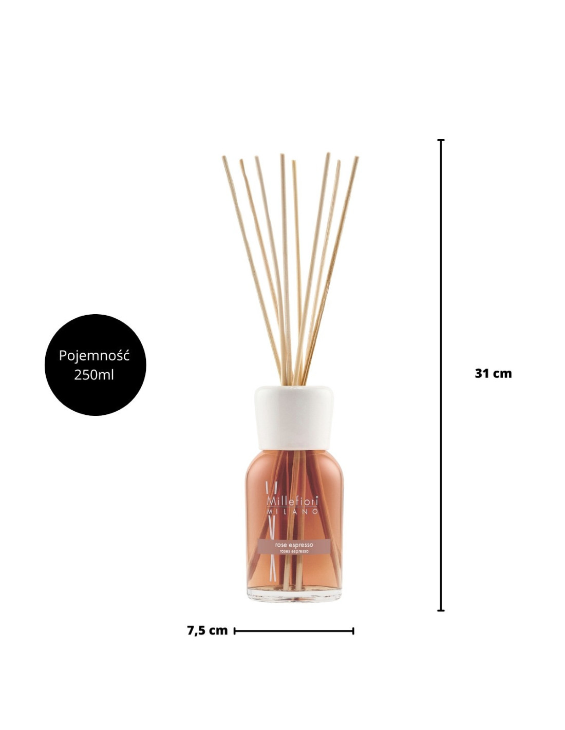 Dyfuzor z patyczkami rattanowymi marki Millefiori MILANO o zapachu ROSE ESPRESSO. Aromat białych kwiatów złączony z nutą świeżo mielonej kawy dopełniony płatkami róż i wanilii doskonale sprawdzi się w salonie, sypialni czy biurze, dodając wnętrzu elegancji i świeżości. Dyfuzor może być stosowany jako odświeżacz powietrza, a zarazem jako dekoracja pomieszczenia. Umieszczony w stylowym, czarnym kartoniku idealnie nadaje się jako prezent na różne okazje.
