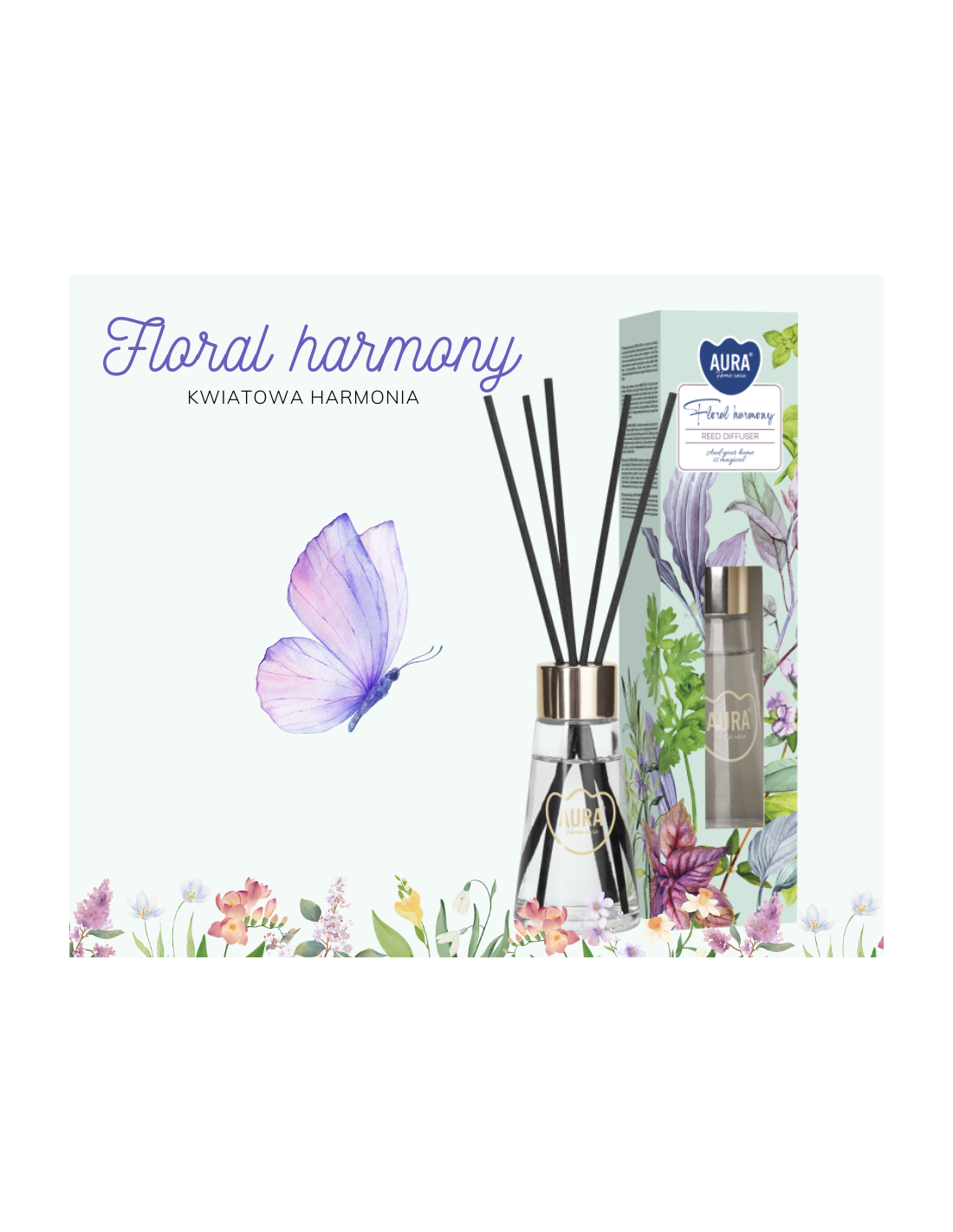 Mały dyfuzor zapachowy marki Aura o aromacie, który łączy w sobie świeżość natury, delikatność kwiatów oraz subtelną słodycz owoców, tworząc zmysłową kompozycję idealną do wprowadzenia harmonii i spokoju w przestrzeni.