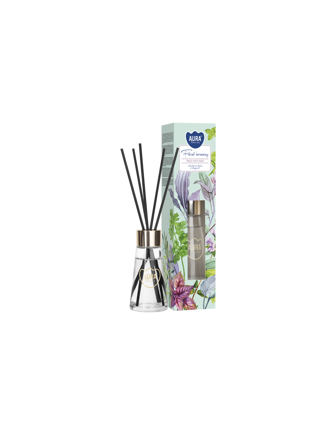 A small fragrance diffuser by Aura with an aroma that combines the freshness of nature, the delicacy of flowers and the subtle sweetness of fruit, creating a sensual composition ideal for introducing harmony and peace into a space.