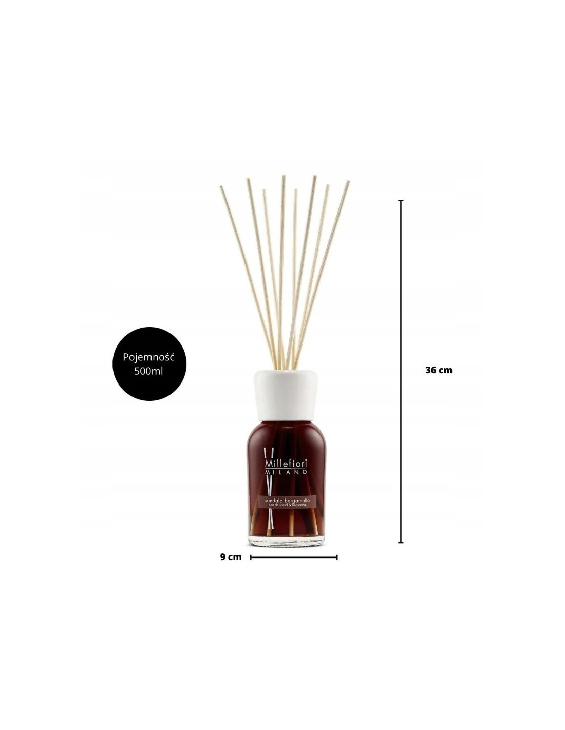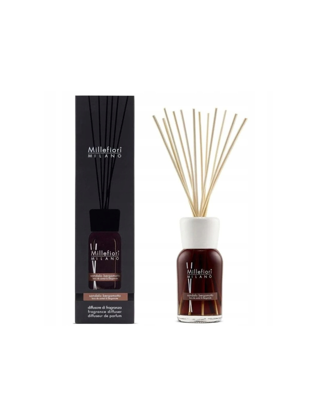 Large diffuser with rattan sticks by Millefiori MILANO with the scent of SANDALO BERGAMOTTO. Woody aromas of sandalwood combined with a hint of citrus and lavender will work perfectly in the living room, bedroom or office, adding elegance and freshness to the interior.