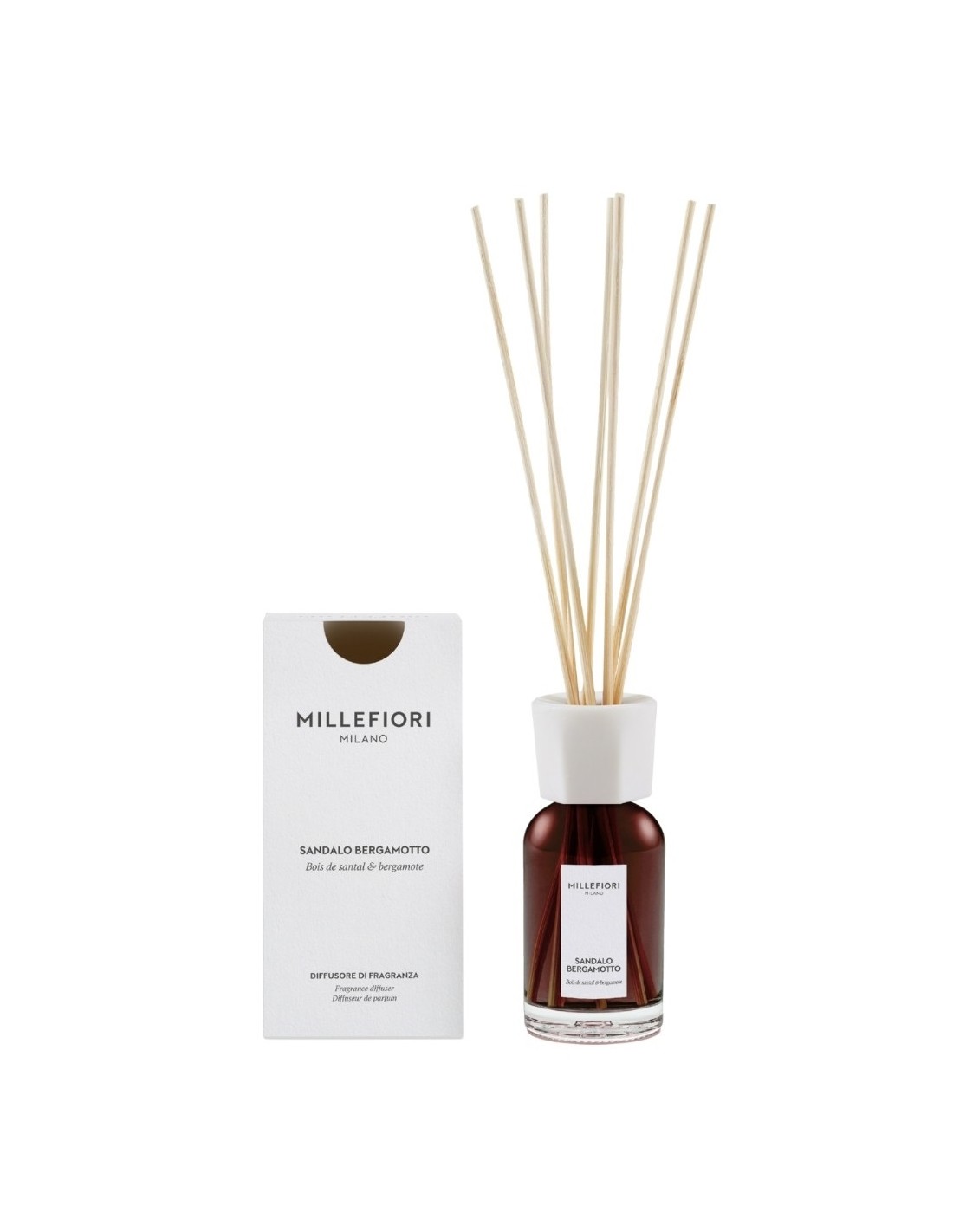 This Millefiori MILANO rattan diffuser with SANDALO BERGAMOTTO fragrance features woody sandalwood aromas combined with hints of citrus and lavender, perfect for living rooms, bedrooms, or offices, adding elegance and freshness to any space.