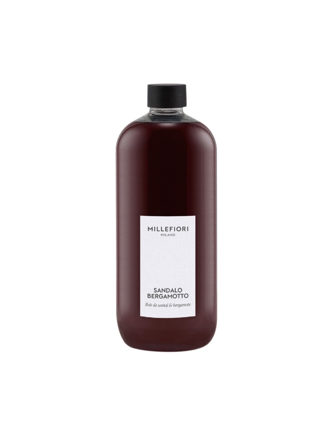 Millefiori MILANO fragrance refill with SANDALO BERGAMOTTO. This bottle contains oil designed specifically for reed diffusers. The woody aroma of sandalwood combined with a hint of citrus and lavender is perfect for living rooms, bedrooms, or offices, adding elegance and freshness to any interior.