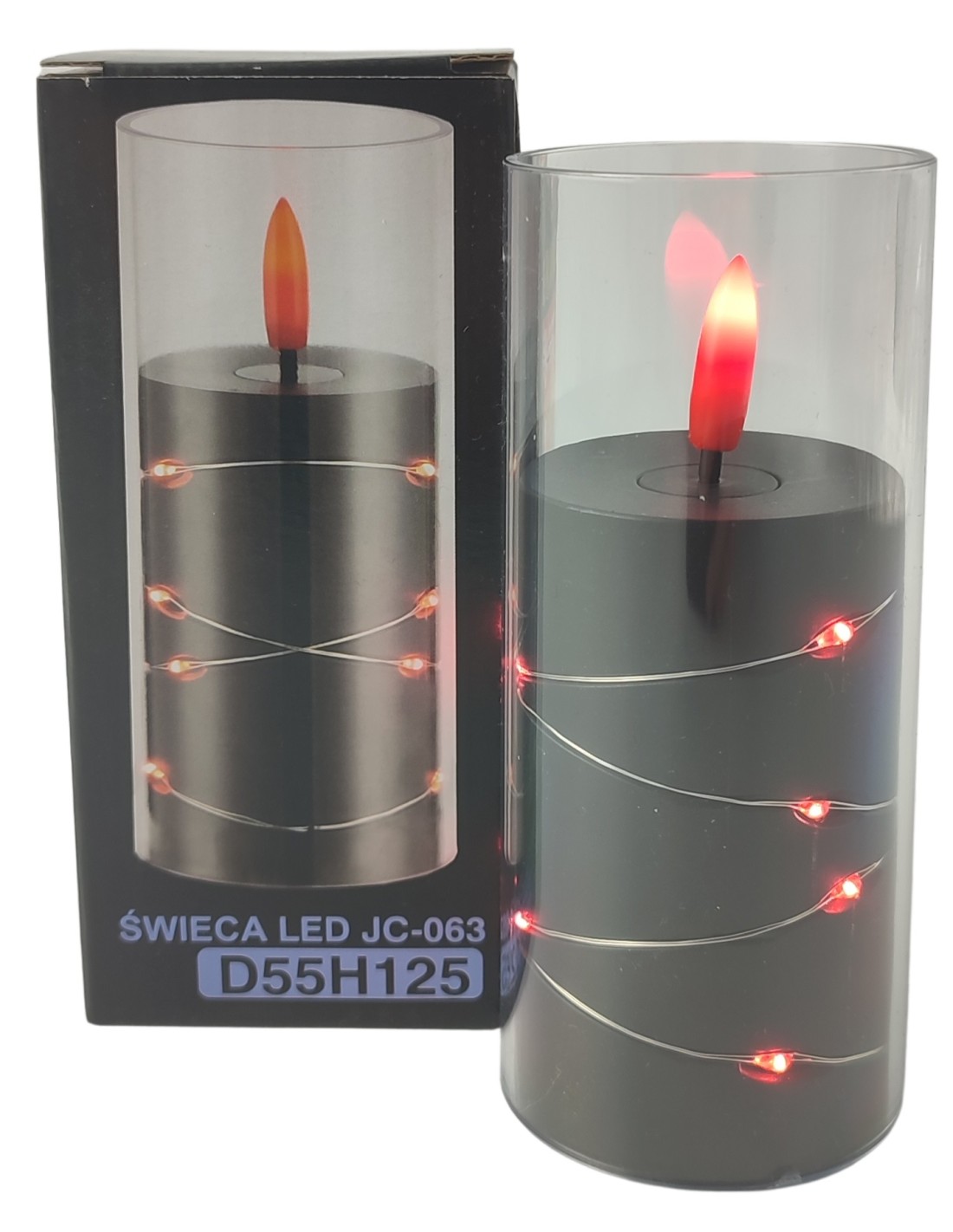 This black LED candle, entwined with a chain of red LEDs, creates an elegant and modern lighting effect that subtly highlights its unique character. An additional advantage is the realistic flickering wick, which faithfully imitates the flame of a real candle, giving the whole piece an even more natural look. It's ideal as a tombstone decoration, for shrines, lanterns, and black votive candles, giving them a stylish and tranquil glow. It can also be used in interior design, centerpieces, or special occasion arrangements. The red LED light contrasts beautifully with the candle's deep black, creating a harmonious whole. It's a practical and durable alternative to traditional candles.