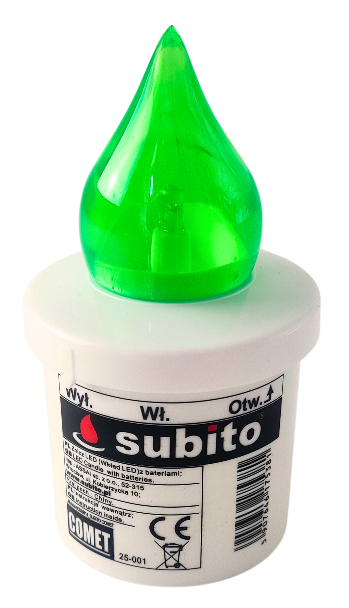 Classic LED insert for candles by Subito powered by R14 batteries. Fits most glass, plastic candles or various types of shrines and lanterns. The LED insert gives pleasant light, and the wide selection of colors allows you to create an interesting illumination.