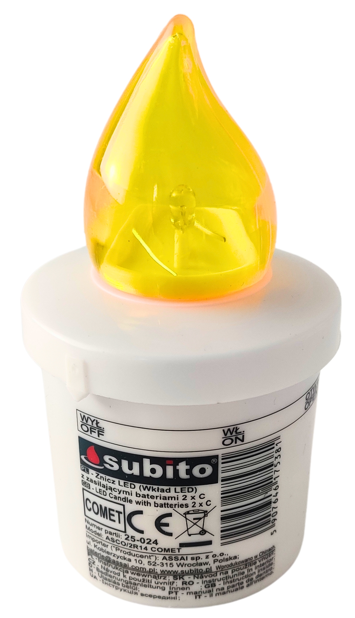 Classic LED insert for candles by Subito powered by R14 batteries. Fits most glass, plastic candles or various types of shrines and lanterns. The LED insert gives pleasant light, and the wide selection of colors allows you to create an interesting illumination.