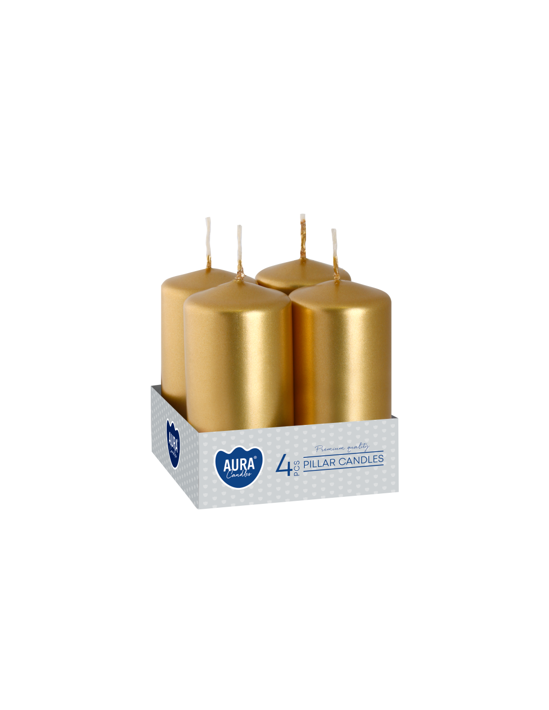 This set of four small pillar candles from AURA in a metallic gold finish is perfect for table decoration and creating an elegant, atmospheric atmosphere. These candles are perfect for parties, weddings, holidays, and special occasions.