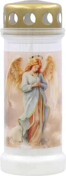 A filled plastic candle in the golden style of the BOLSIUS brand. The graphic with a shimmering golden angel is a combination of modern design and classic, sacred symbolism. A solid wide base ensures stability, and thick, high-quality plastic guarantees durability and resistance to weather conditions. The metal, golden lid adds a refined character, emphasizing the elegance of the whole, and the wax without added palm oil makes the candle an ecological choice. It can be used as a stand-alone candle or as an insert for larger glass lanterns or lanterns. It is an excellent choice for people who value aesthetics, durability and deep symbolism.