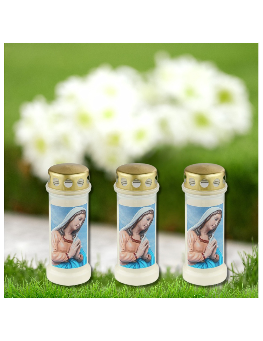 This BOLSIUS branded plastic candle features a graphic depiction of the praying Virgin Mary, exuding peace and spiritual warmth, creating a solemn atmosphere of remembrance and contemplation. This motif perfectly highlights a place of prayer and tribute to loved ones.