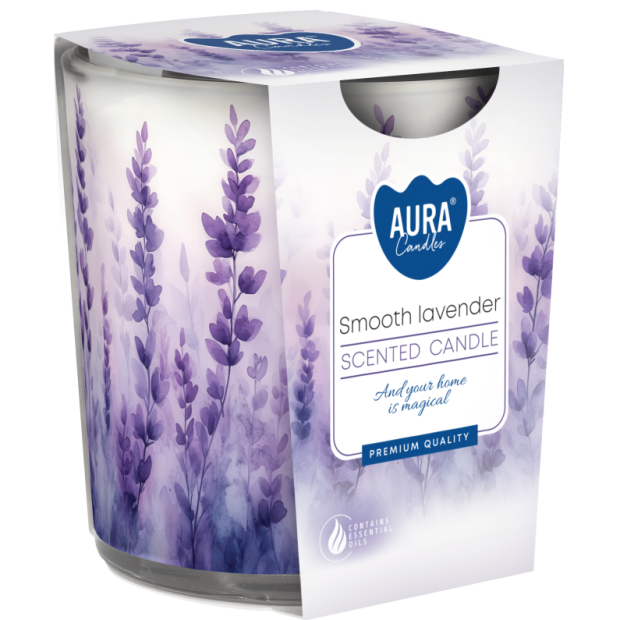 Candle with graphic patterns in simple glass with a delicate, herbal scent of lavender. Decorative foil with a beautiful, lavender motif presents an endless, picturesque field of plants, giving an idyllic character to any room in which it is located. The scent notes of the candle will help create a calm and elegant atmosphere.