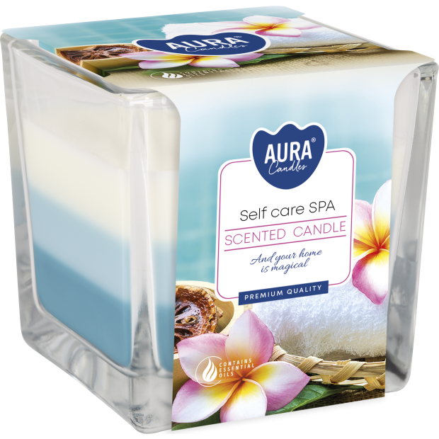 Small scented candle in square glass with a three-colored filling with a burning time of up to 32 hours. Two cotton wicks ensure even burning of the wax and make the candle glow more intense. Decorative graphics on the packaging make the candle ideal as a gift for various occasions. Available in various scents.