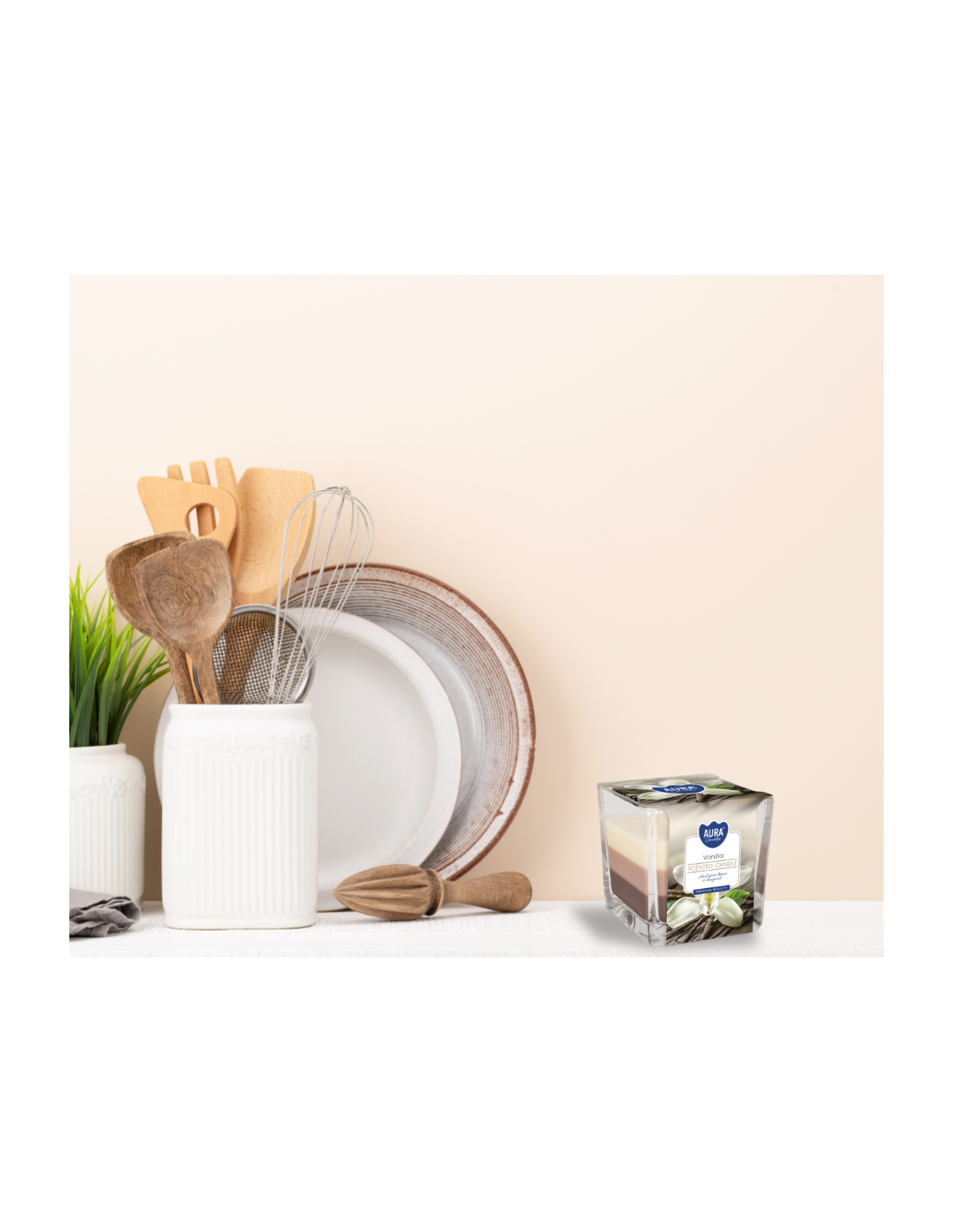 Aura brand scented candle with a classic, warm and sweet vanilla scent that envelops the room in a pleasant and calming atmosphere. This aroma has a delicate, creamy note that is associated with the homely atmosphere of a freshly baked cake and is one of the most popular in the category of scented candles.