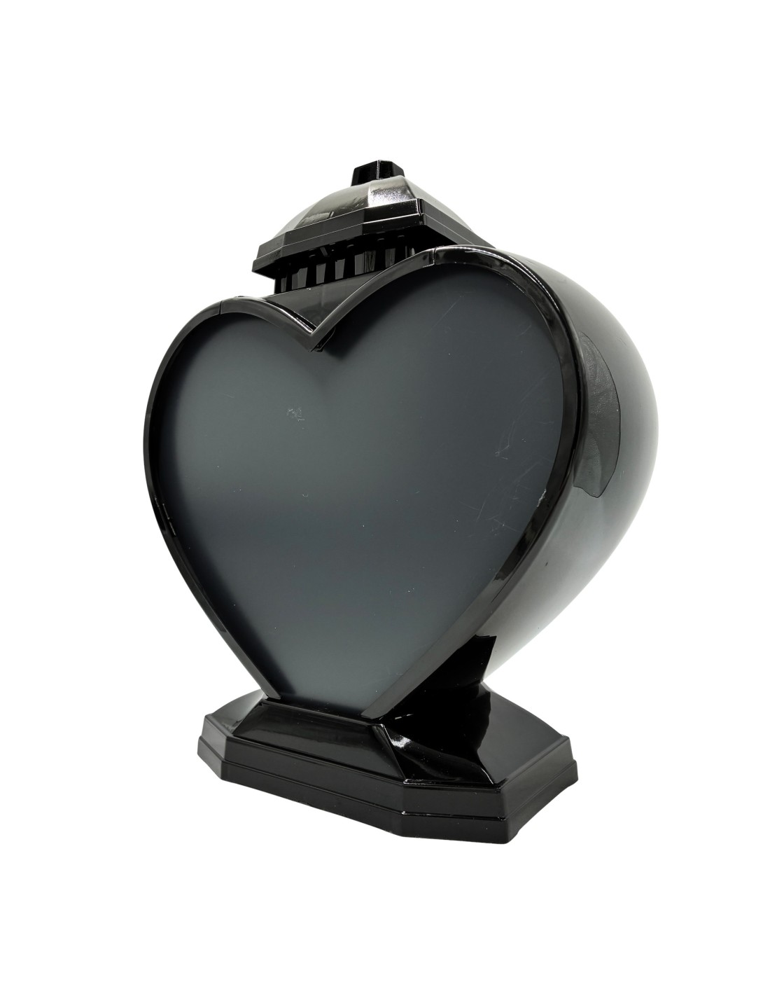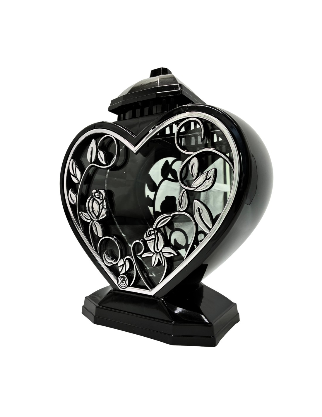 GLAS HITElegancki znicz GLAMUR Serce duże z motywem srebrnego serca w czarnym wykończeniu. Trwały, stabilny i odporny na warunki atmosferyczne — idealna dekoracja nagrobna, która podkreśla pamięć o bliskich.