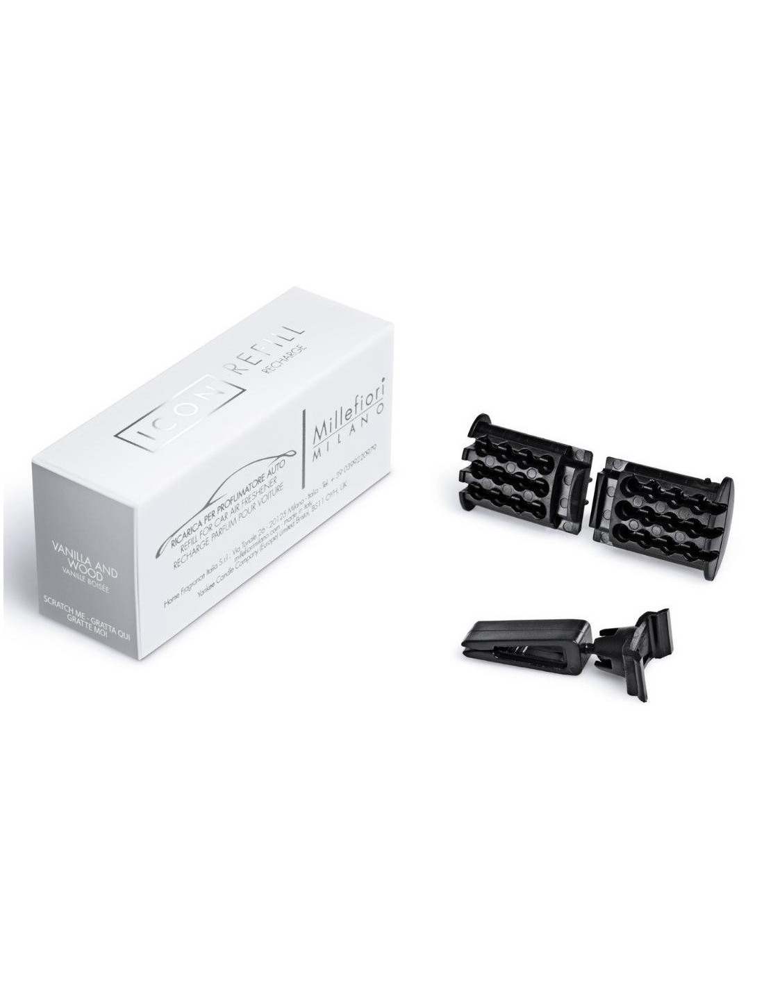 Wkład do odświeżacza samochodowego Millefiori Milano ICON o aromacie VANILLA AND WOOD. Słodki zapach wanilii dopełniony aromatem karmelu i nutami drzewnymi doda wnętrzu pojazdu elegancji i świeżości.