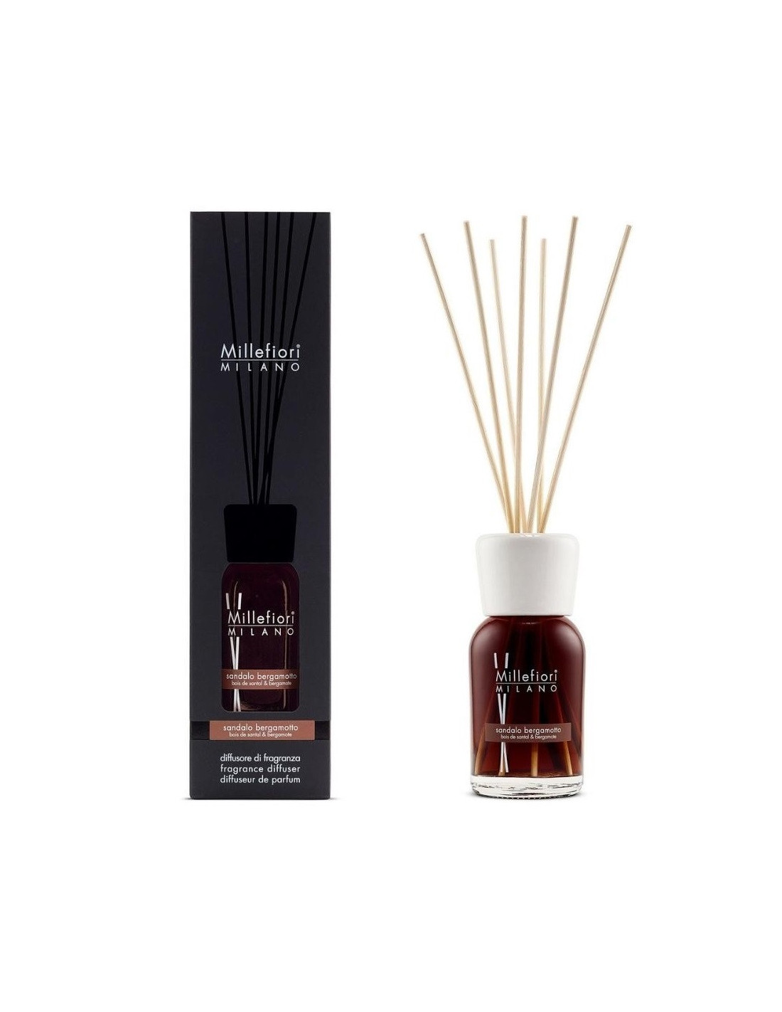 Difuzér s ratanovými tyčinkami od Millefiori MILANO s vôňou SANDALO BERGAMOTTO. Drevité arómy santalového dreva v kombinácii s nádychom citrusov a levandule skvele zapadnú do obývačky, spálne či kancelárie a dodajú interiéru eleganciu a sviežosť.