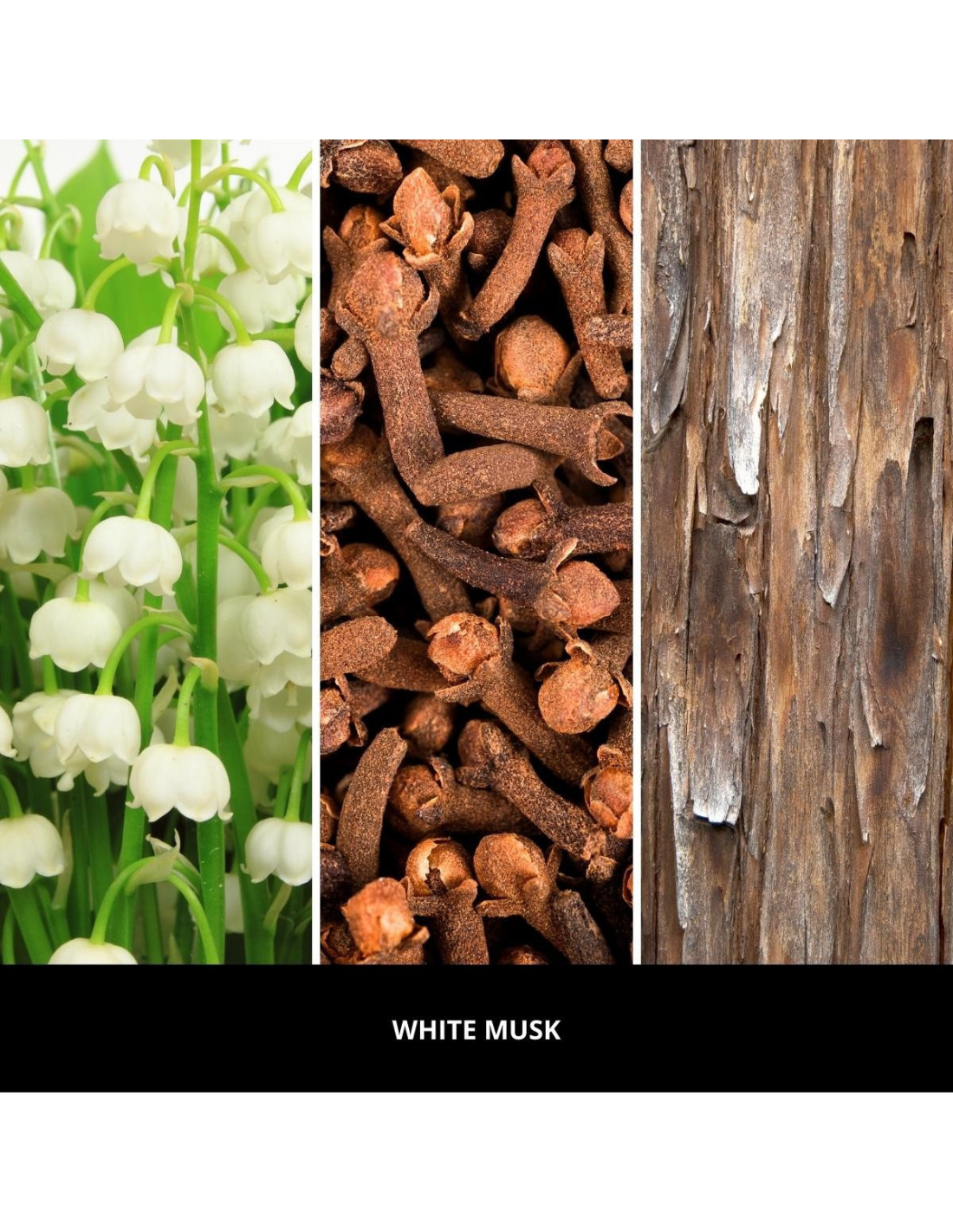 Vonný olej White Musk je jemná, no zároveň zmyselná kompozícia, v ktorej sa kvetinové akcenty konvalinky, fialky a pomarančových kvetov prelínajú s púdrovým pižmom. Aromatické srdce s nádychom klinčekov a anízu dodáva vôni hĺbku a sofistikovanosť. Celok dopĺňajú hrejivé, krémové tóny cédrového dreva, fazule tonka a bobúľ vanilky, ktoré vytvárajú jemnú a elegantnú vôňu pre každodennú relaxáciu.