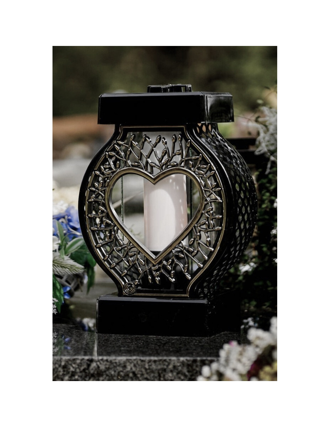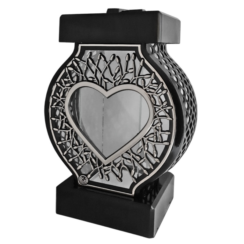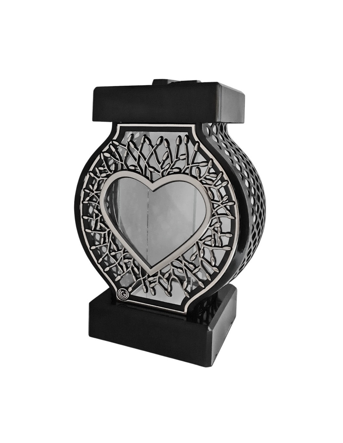 GLAS HITElegantná veľká sviečka GLAMUR Circle Rattan sa vyznačuje jemným strieborným motívom srdca v čiernej povrchovej úprave. Je odolná, stabilná a odolná voči poveternostným vplyvom – perfektná dekorácia na náhrobok na pamiatku blízkych.