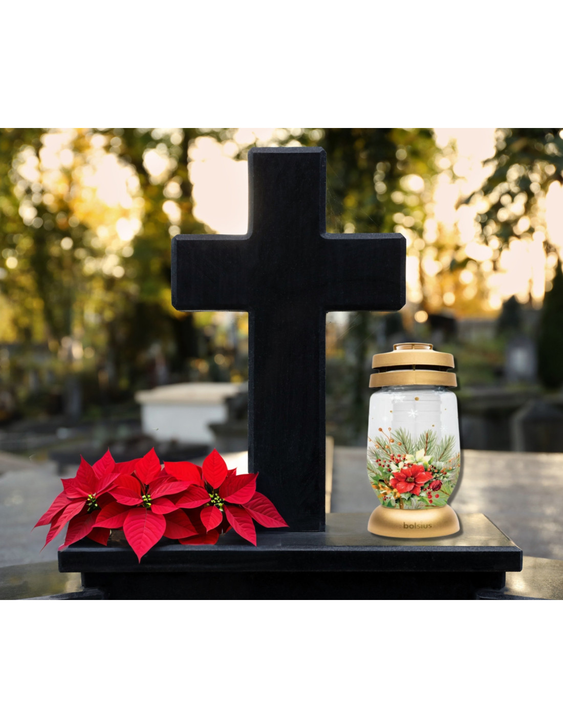 Dekoratívny vianočný lampión s motívom vianočného venca a snehových vločiek. Vyrobený z kvalitného, priehľadného skla, plameň je krásne viditeľný. Jeho veľká základňa ho robí veľmi stabilným a vďaka špeciálnej konštrukcii a "čiapke" je vnútorná vložka dokonale chránená pred vetrom a vodou. Elegantný a moderný, vyzerá skvele ako hlavná dekorácia na náhrobných kameňoch.