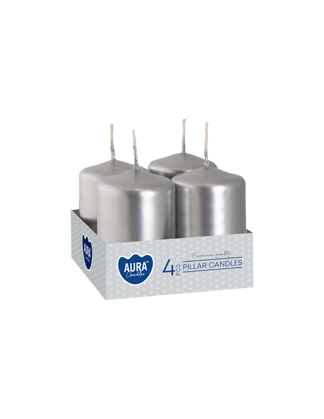 Sada štyroch malých stĺpových sviečok od AURA v elegantnej metalickej striebornej farbe, ktorá dodá moderný, decentný a luxusný nádych každému interiéru. Tieto stĺpové sviečky sú perfektnou voľbou na ozdobenie akéhokoľvek stola, ideálne na večierky, recepcie, svadby alebo večere. Strieborné sviečky prinášajú pokoj, žiarivosť a elegantnú, relaxačnú atmosféru do obývačky, spálne alebo kúpeľne. Sú nadčasovou voľbou na sviatky, výročia alebo iné špeciálne príležitosti.
