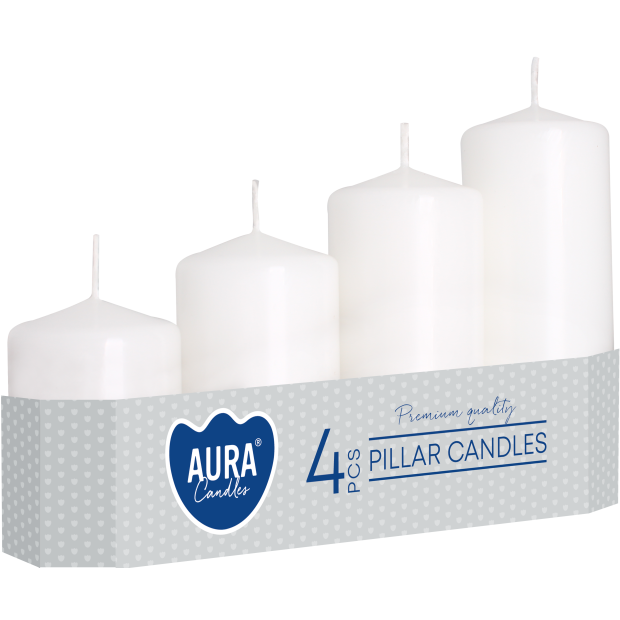 Sada štyroch stupňovitých stĺpových sviečok AURA v klasickej bielej farbe, ktorá je vhodná na vytvorenie útulnej atmosféry v každom interiéri. Valce v tejto farbe sú výbornou voľbou na ozdobenie každého stola, pretože sú ideálnou možnosťou na recepcie, bankety, svadby a večere. Biele sviečky prinášajú do obývačky, spálne či kúpeľne pokoj, harmóniu a relaxačnú atmosféru. Je to nadčasová voľba na sviatky, výročia alebo iné výnimočné chvíle.