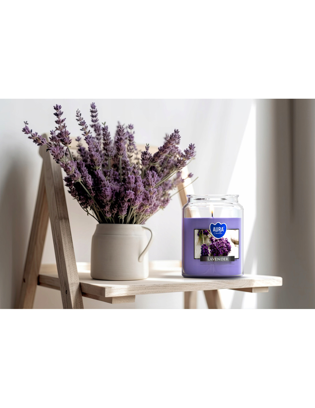 Świeca zapachowa marki Aura o klasycznym, pięknym zapachu lawendy. Jej aromaty to połączenie nuty ziołowej, drzewa różanego oraz bobu tonka. Zapach ten kojarzy się z relaksem i spokojem będąc popularnym w aromaterapii jako środek łagodzący stres. Lawenda może stanowić naturalną metodę na zmniejszenie liczby owadów w pobliżu. Jest również jednym z najpopularniejszych aromatów w kategorii świec zapachowych.