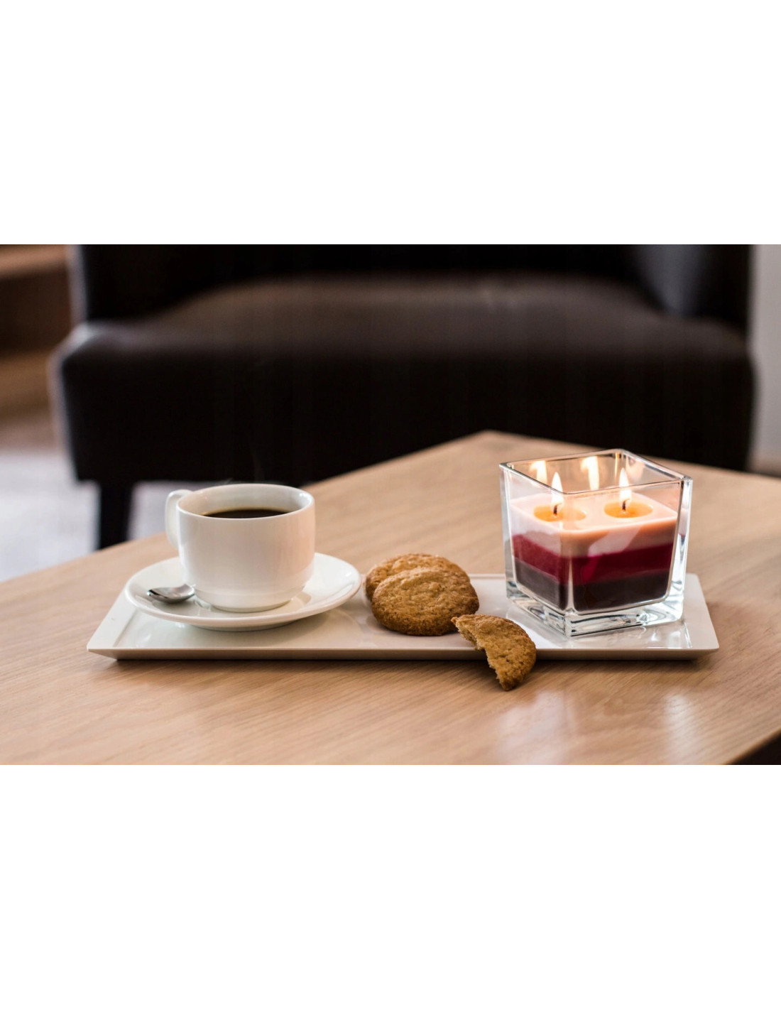 Mała świeca zapachowa w kwadratowym szkle z trójkolorową zalewą o czasie palenia do 32 godzin. Dwa bawełniane knoty zapewniają równomierne wypalanie wosku i sprawiają, że blask świecy jest intensywniejszy. Ozdobna grafika na opakowaniu sprawia, że świeca idealnie nadaje się jako prezent na różne okazje. Dostępna w różnych wariantach zapachowych.