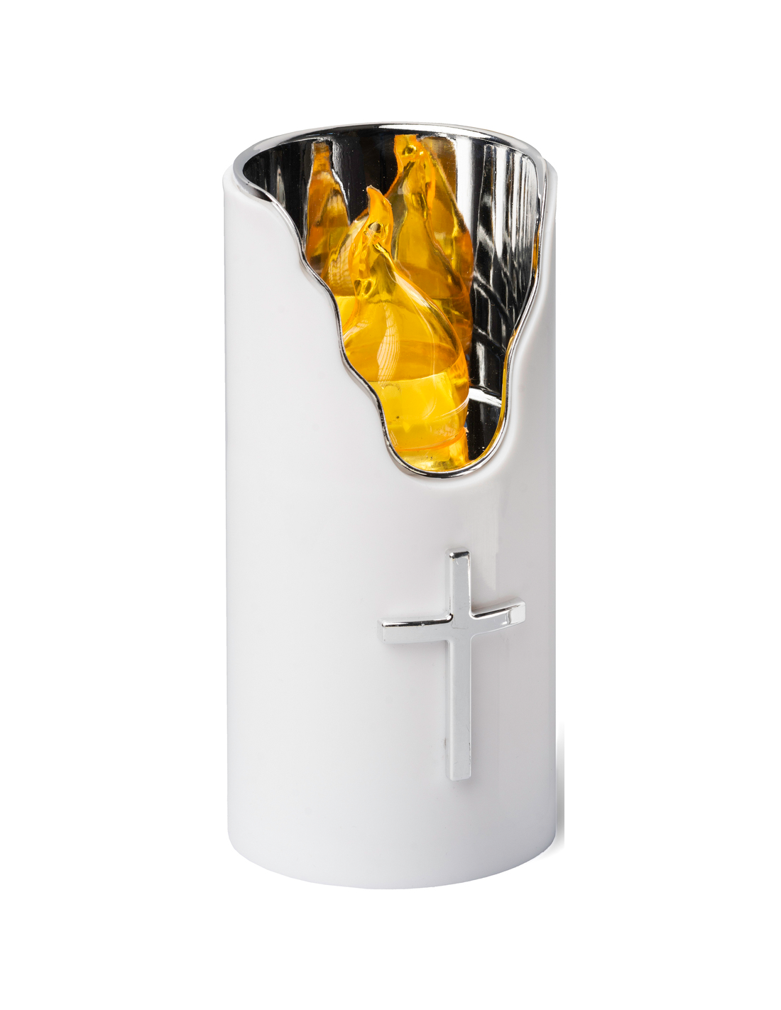 Dekoracyjny wkład do zniczy zasilany bateriami. Pasuje do większości zniczy szklanych lub plastikowych. Daje przyjemne światło, a bogaty wybór kolorów umożliwia stworzenie ciekawej iluminacji. Jego srebrne dodatki nadają mu ekskluzywny wygląd.