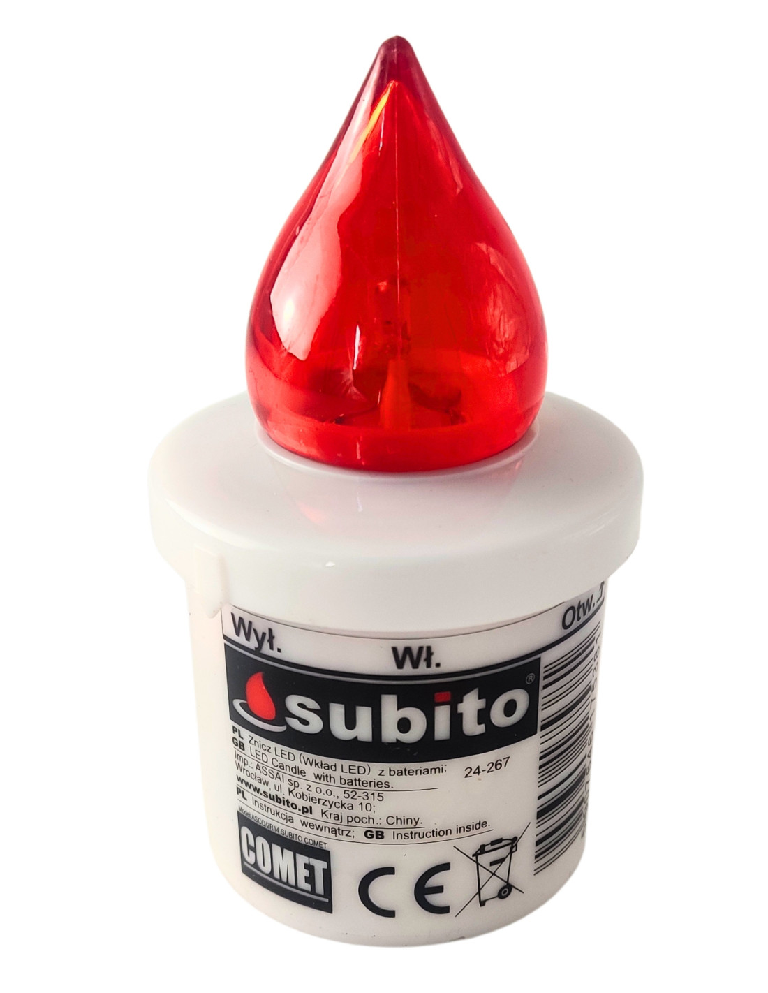 Klasyczny wkład LED do zniczy marki Subito zasilany bateriami R14. Pasuje do większości zniczy szklanych, plastikowych bądź różnego rodzaju kapliczek i latarenek. Wkład LED daje przyjemne światło, a bogaty wybór kolorów umożliwia stworzenie ciekawej iluminacji.
