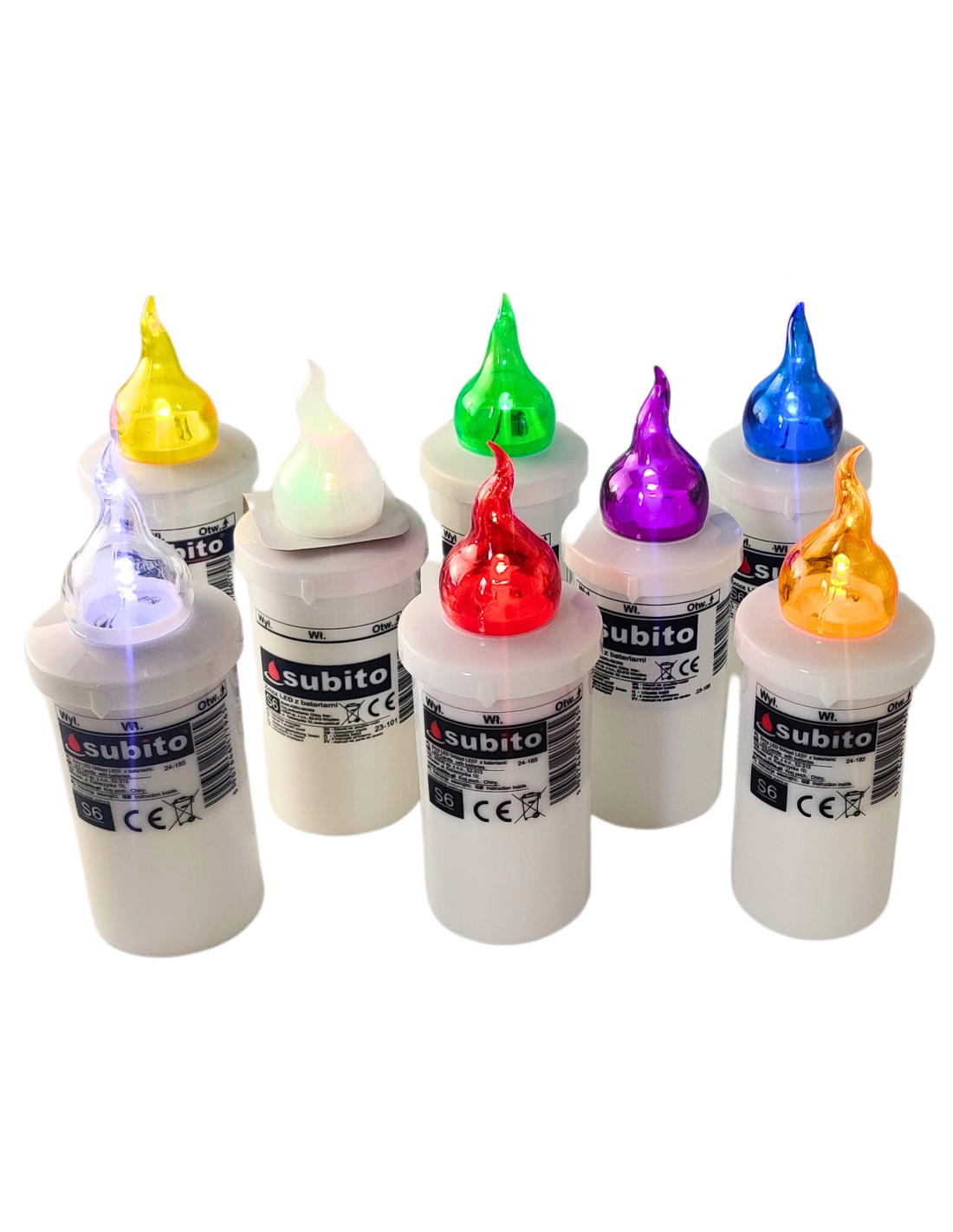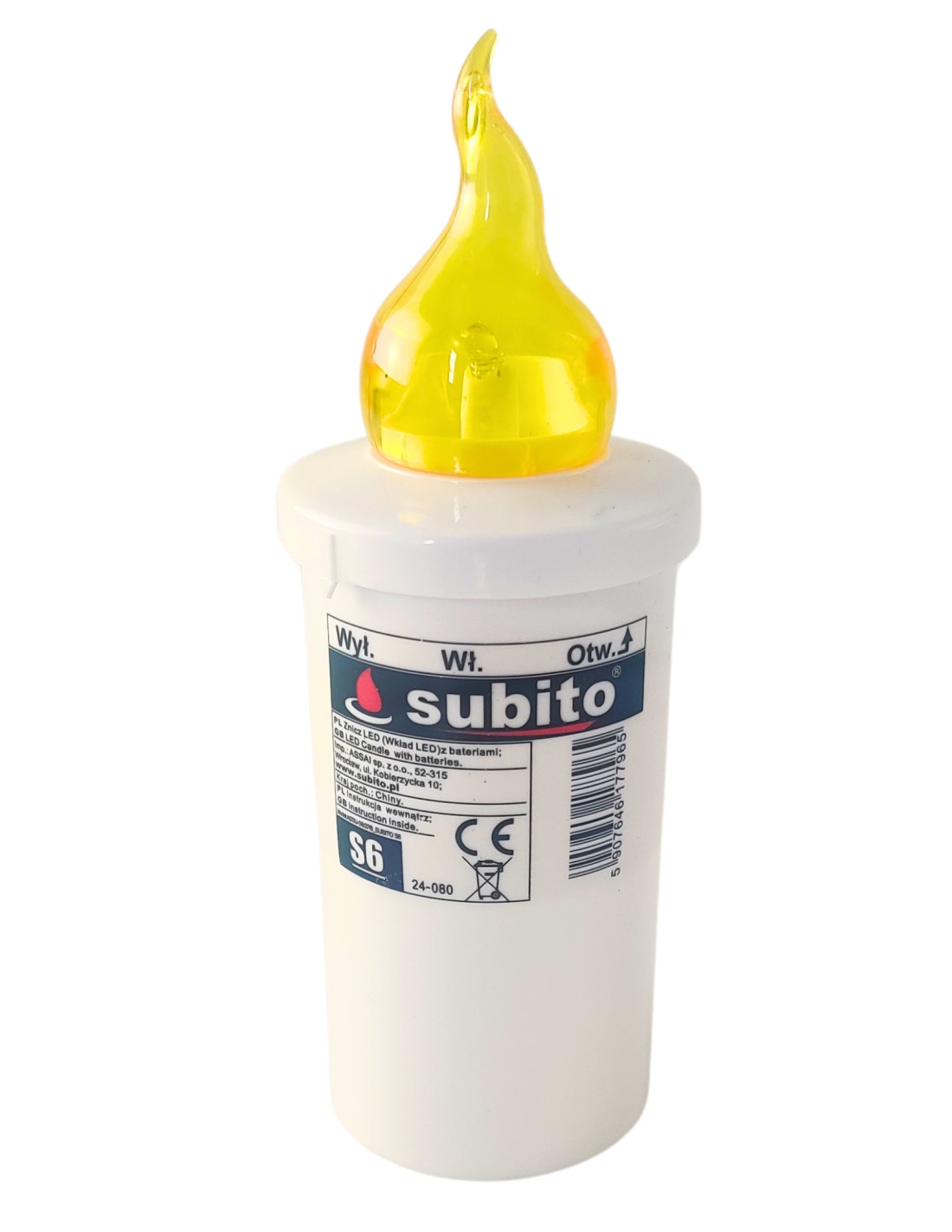 Klasyczny wkład LED do zniczy marki Subito zasilany bateriami R6. Pasuje do większości zniczy szklanych, plastikowych bądź różnego rodzaju kapliczek i latarenek. Wkład LED daje przyjemne światło, a bogaty wybór kolorów umożliwia stworzenie ciekawej iluminacji.