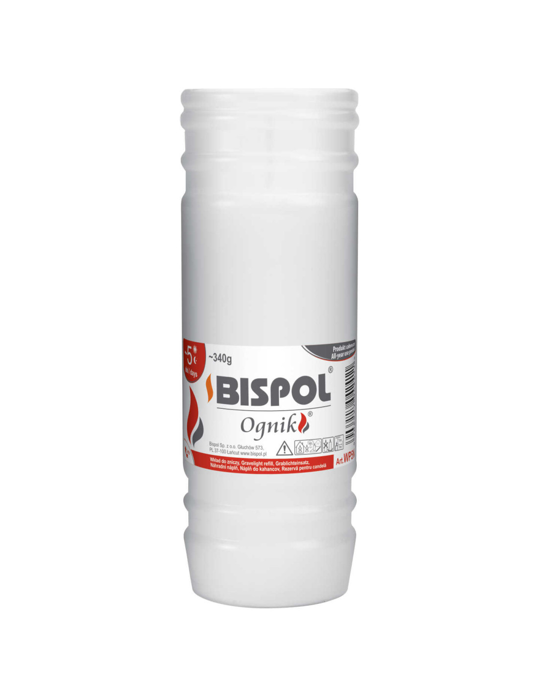 Wkłady do zniczy Bispol są idealnym rozwiązaniem całorocznym, sprawdzającym się w różnych warunkach pogodowych. Standardowe kształty oraz szeroka dostępność (różnorodność) wymiarów umożliwiają dopasowanie do wszystkich zniczy dostępnych na rynku. Wkłady Bispol wypalają się równomiernie dzięki umieszczeniu knota dokładnie w centralnym miejscu, a także dzięki zastosowaniu w produkcji najwyższej jakości surowca.