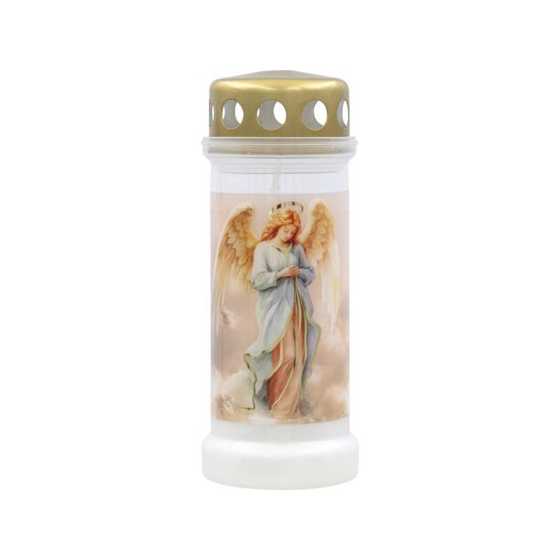 Zalewany plastikowy znicz w złotej stylistyce marki BOLSIUS. Grafika z mieniącym się na złoto aniołem to połączenie nowoczesnego designu i klasycznej, świętej symboliki. Solidna szeroka podstawa zapewnia stabilność, a gruby, wysokiej jakości plastik gwarantuje trwałość i odporność na warunki atmosferyczne. Metalowe, złote wieczko dodaje wyrafinowanego charakteru, podkreślając elegancję całości, a wosk bez dodatku oleju palmowego czyni znicz ekologicznym wyborem. Może być używany jako samodzielny znicz lub jako wkład do większych szklanych lampionów bądź latarni. To doskonały wybór dla osób ceniących estetykę, trwałość i głęboką symbolikę.