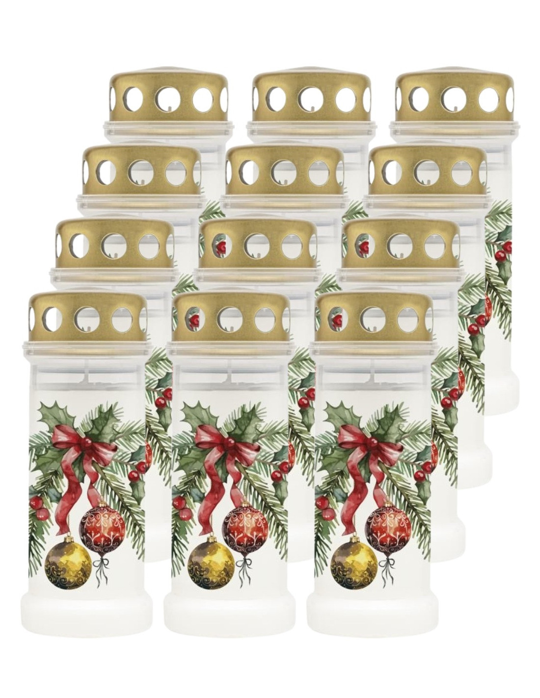 Zalewany plastikowy znicz w złotej stylistyce marki BOLSIUS. Grafika z wstążką świąteczną ozdobioną bombkami, czerwoną kokardą i jemiołą to połączenie eleganckiego, nowoczesnego designu z tradycyjną symboliką świąt. Solidna szeroka podstawa zapewnia stabilność, a gruby, wysokiej jakości plastik gwarantuje trwałość i odporność na warunki atmosferyczne. Metalowe, złote wieczko dodaje wyrafinowanego charakteru, podkreślając elegancję całości, a wosk bez dodatku oleju palmowego czyni znicz ekologicznym wyborem. Może być używany jako samodzielny znicz lub jako wkład do większych szklanych lampionów bądź latarni. To doskonały wybór dla osób ceniących estetykę, trwałość i głęboką symbolikę.