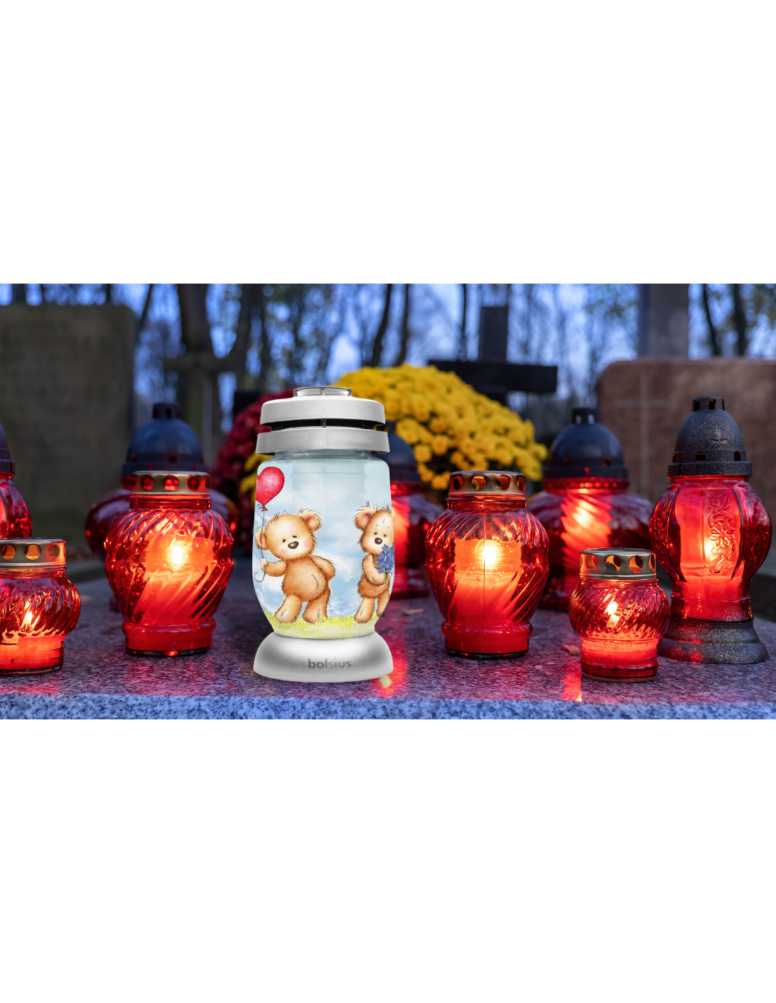 Ozdobny lampion przedstawiający dwa pluszowe misie trzymające w łapkach baloniki i kwiaty. Wykonany z wysokiej jakości przeźroczystego szkła, przez które pięknie widać płomień. Dzięki dużej podstawie jest bardzo stabilny, a za sprawą specjalnej konstrukcji oraz „kapturka” wkład w jego wnętrzu jest doskonale chroniony przed wiatrem i wodą. Elegancki i nowoczesny, wspaniale prezentuje się jako główna dekoracja nagrobków.